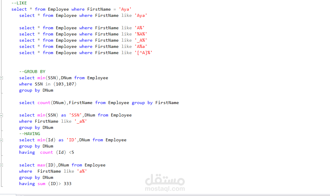 استخدام الدوال مثل Count و Min و Max و Coalesce و Concat