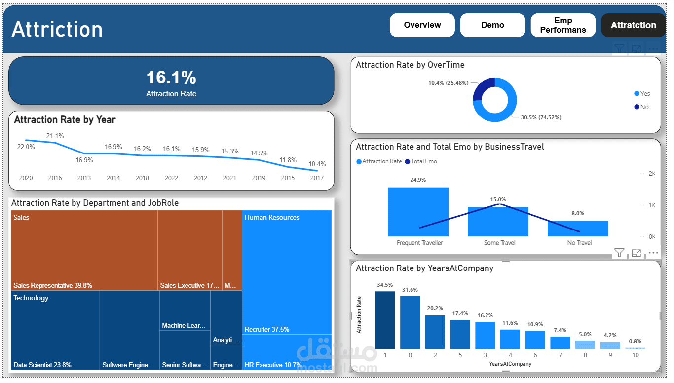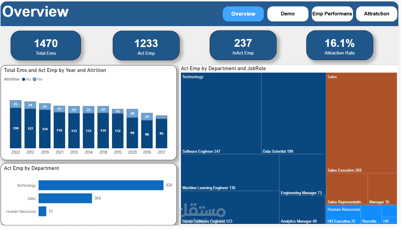 نظرة عامة على القوى العاملة (Overview): تتبع فوري لعدد الموظفين، ونسب الاستقالات (Attrition Rate) التي بلغت في هذا النموذج 16.1%، مع تحليل دقيق للأقسام والأدوار الوظيفية الأكثر تأثراً.