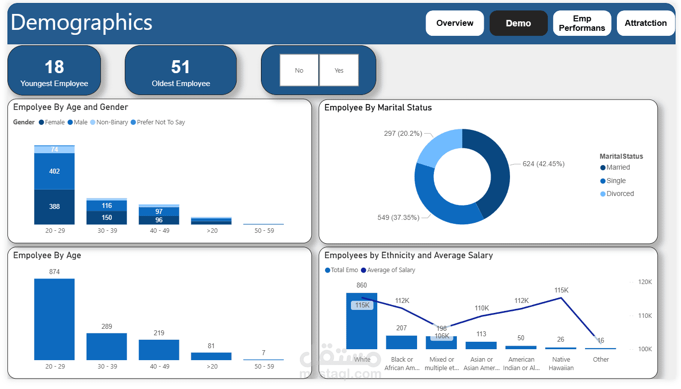لقد قمت بتطوير لوحة بيانات تفاعلية (Interactive Dashboard) شاملة لتحليل بيانات الموارد البشرية باستخدام Power BI، تهدف إلى مساعدة مديري الشركات والـ HR في اتخاذ قرارات مبنية على حقائق لا على مجرد تخمينات.