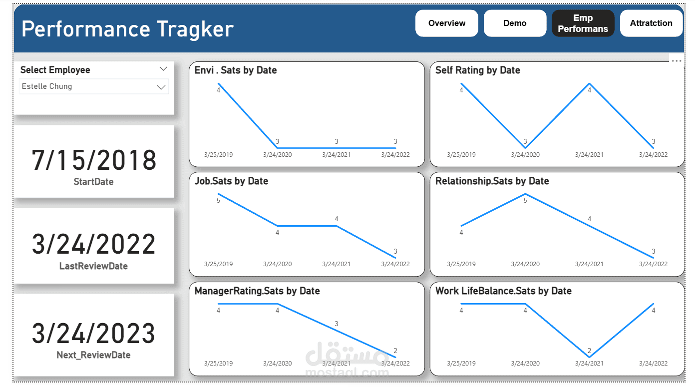 تتبع الأداء والرضا (Performance Tracker): هنا ننتقل من "الكل" إلى "الفرد"؛ حيث تتيح اللوحة مراقبة أداء كل موظف على حدة، وتطور مستويات رضاه عن العمل والبيئة المحيطة به بمرور الوقت.
