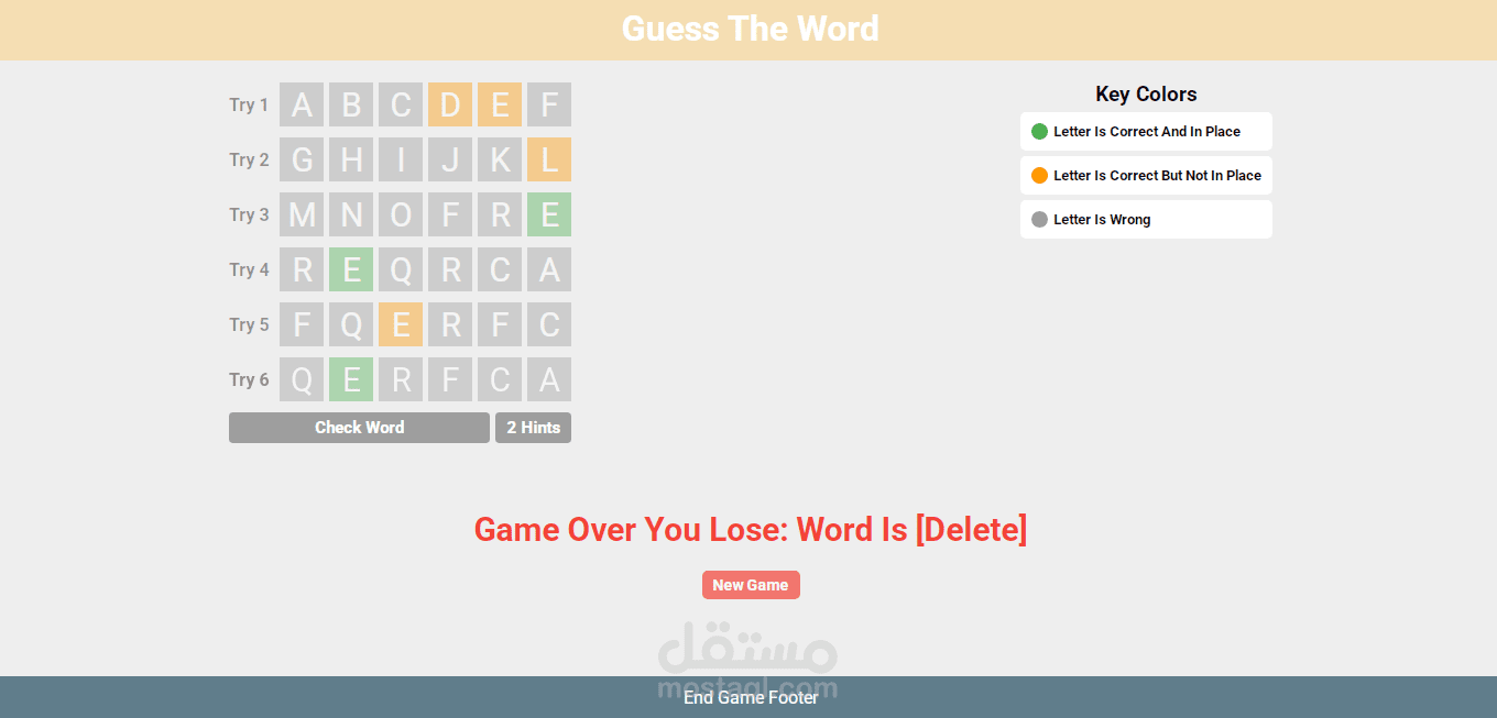 عند استنفاذ جميع المحاولات تظهر رسالة Game Over مع عرض الكلمة الصحيحة.