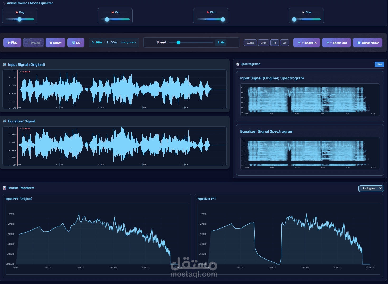 A web-based audio equalizer for music and biomedical applications (e.g., hearing aid abnormality detection). Allows users to manipulate frequency components and reconstruct signals. Features customized modes to isolate specific musical instruments, animal sounds, or human voices based on characteristics like gender or age.