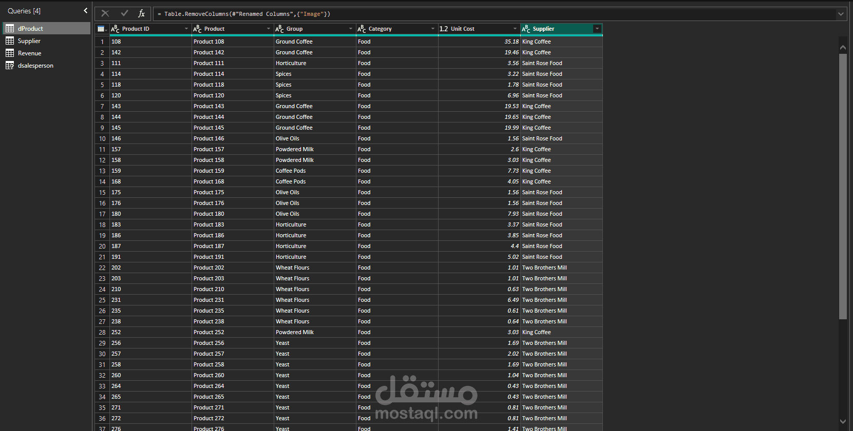 في مرحلة تنظيف ومعالجة البيانات باستخدام Power Query تم العمل على تنظيم البيانات وتحسين جودتها قبل البدء في التحليل. تم تصحيح أنواع البيانات الخاصة بالتواريخ والقيم الرقمية، كما تم حذف الأعمدة غير الضرورية لتبسيط نموذج البيانات. تم كذلك دمج بيانات الموردين مع بيانات المنتجات باستخدام عمليات Merge Queries لضمان تكامل البيانات بين الجداول. بالإضافة إلى ذلك تم إعادة تسمية بعض الحقول وتنظيم الأعمدة لتكون أكثر وضوحًا أثناء التحليل.