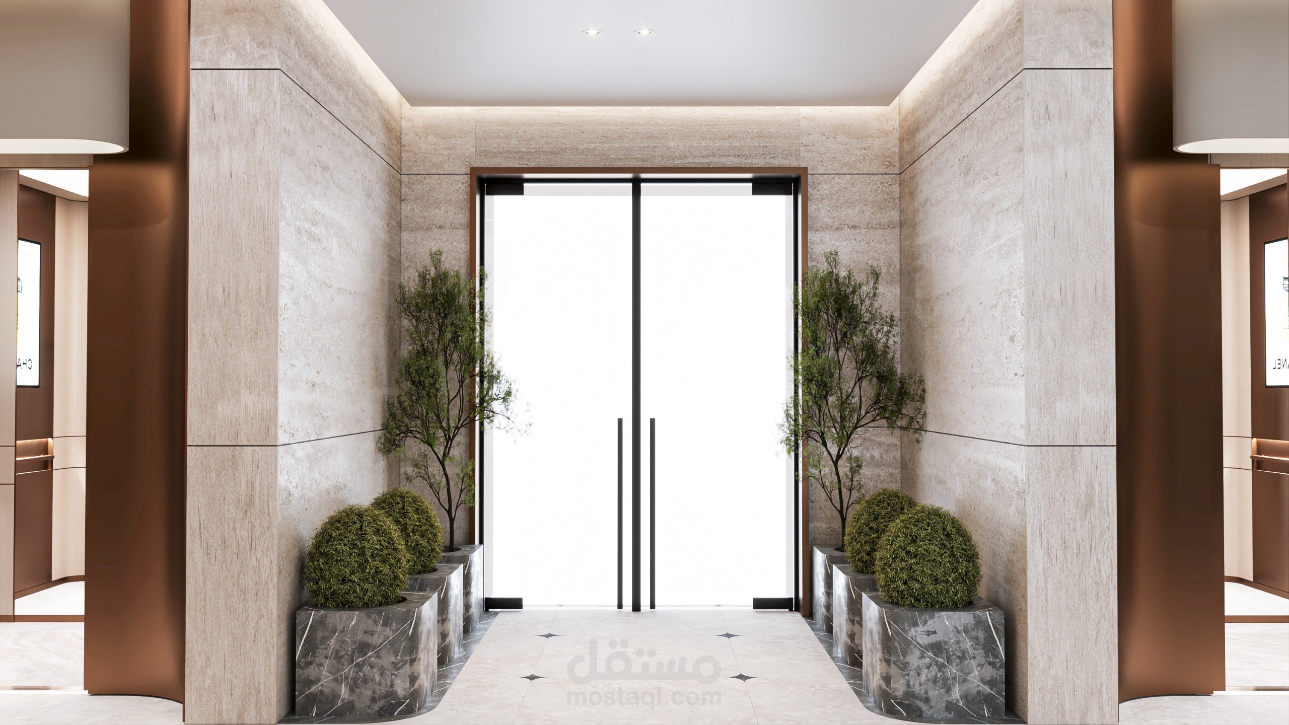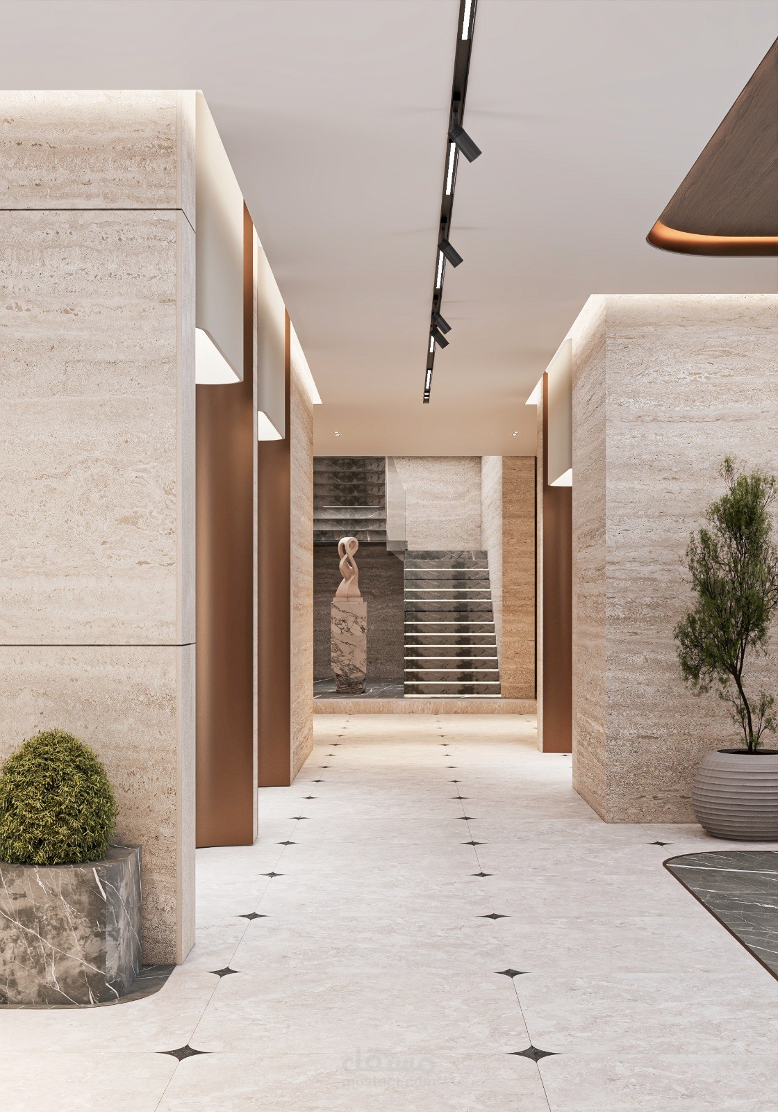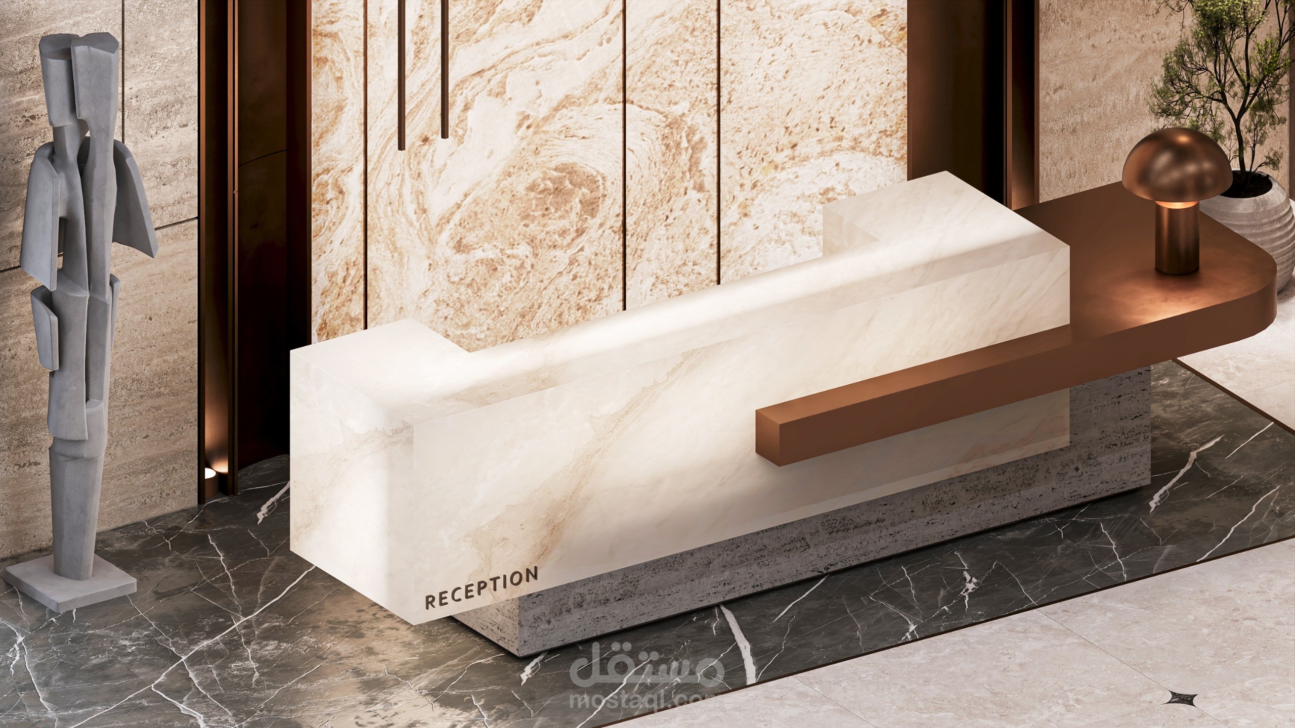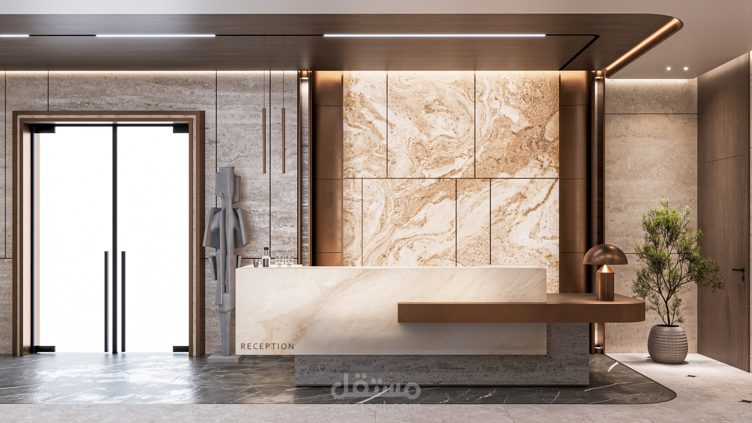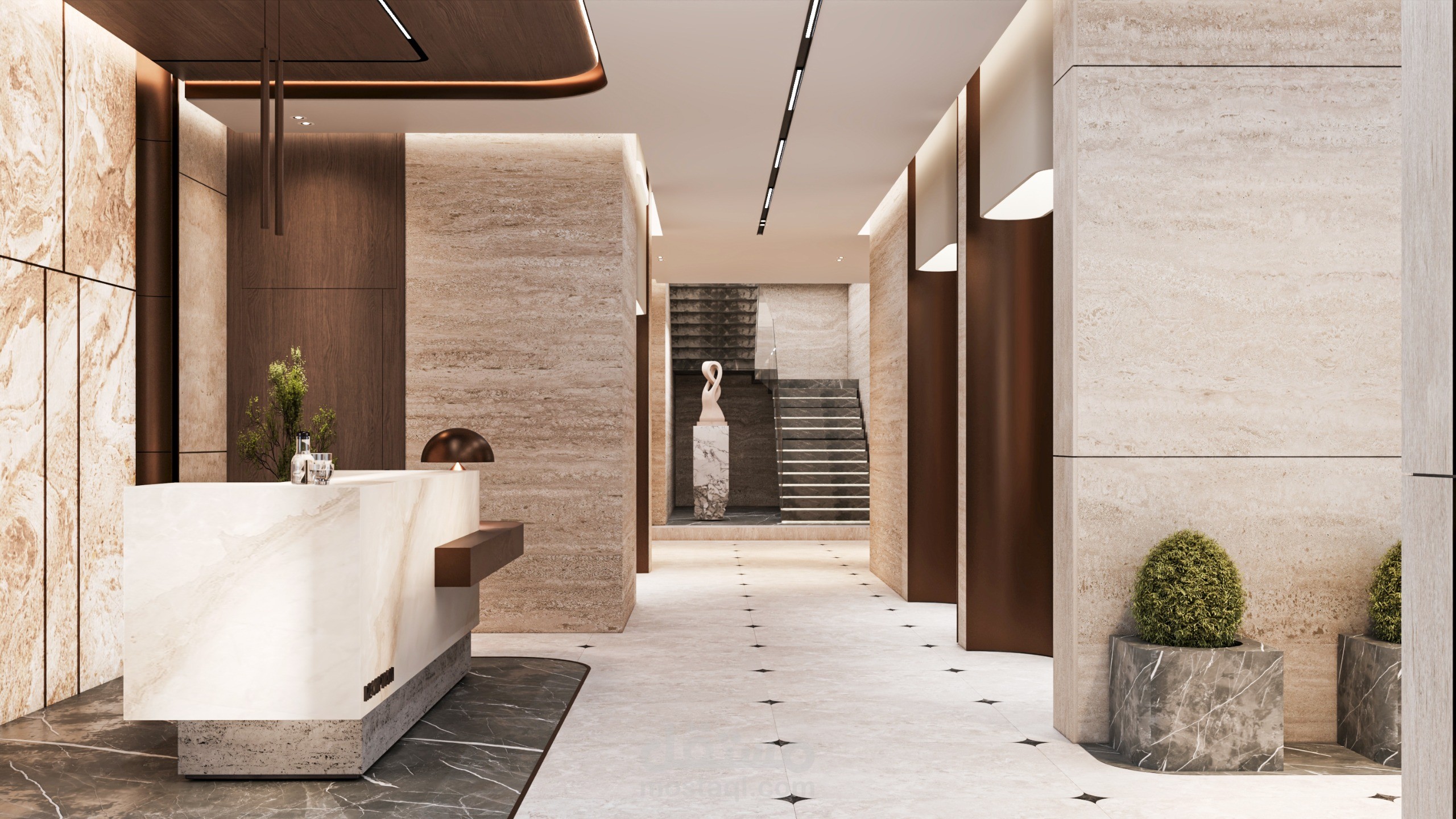 This project showcases the entrance lobby of a residential tower located in Saudi Arabia, designed to reflect a modern, elegant, and welcoming atmosphere. The concept focuses on creating a strong first impression through the use of premium materials such as natural marble, textured wall panels, and warm metallic accents.