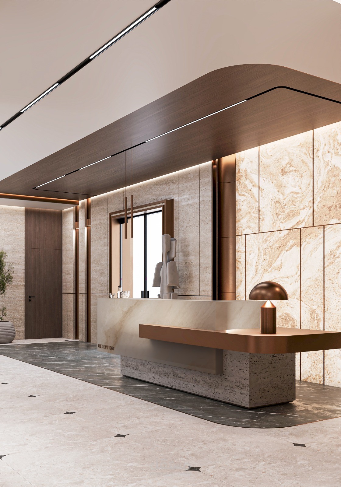 The reception desk was designed with clean, minimal lines and luxurious finishes to emphasize both functionality and visual impact. Indirect lighting was carefully integrated to highlight the material textures and enhance the overall ambience. Neutral tones combined with warm lighting create a balanced and sophisticated environment that aligns with contemporary residential standards in the region.