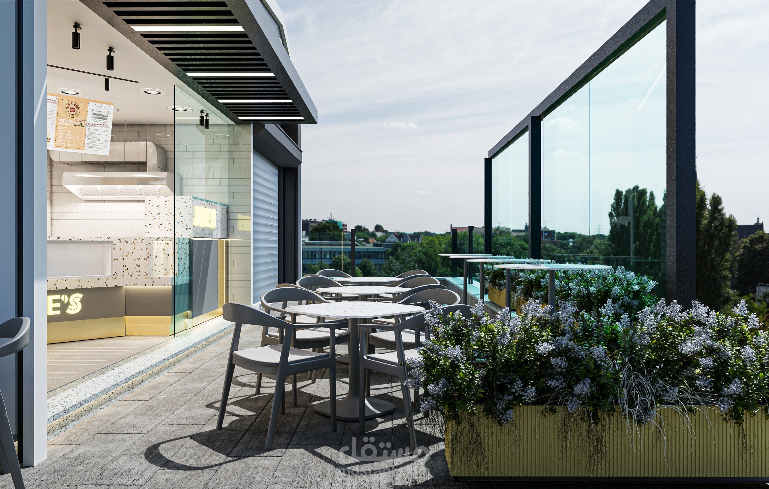 Contemporary food kiosk design for “JOE’S” restaurant in Egypt, created to deliver a strong street presence within a compact footprint. The concept combines clean geometric forms, neutral tones, and terrazzo finishes to achieve a modern and inviting identity. The open façade enhances customer interaction, while integrated lighting and illuminated signage strengthen brand visibility and attract attention. Outdoor seating was designed to extend the customer experience and create a welcoming atmosphere.