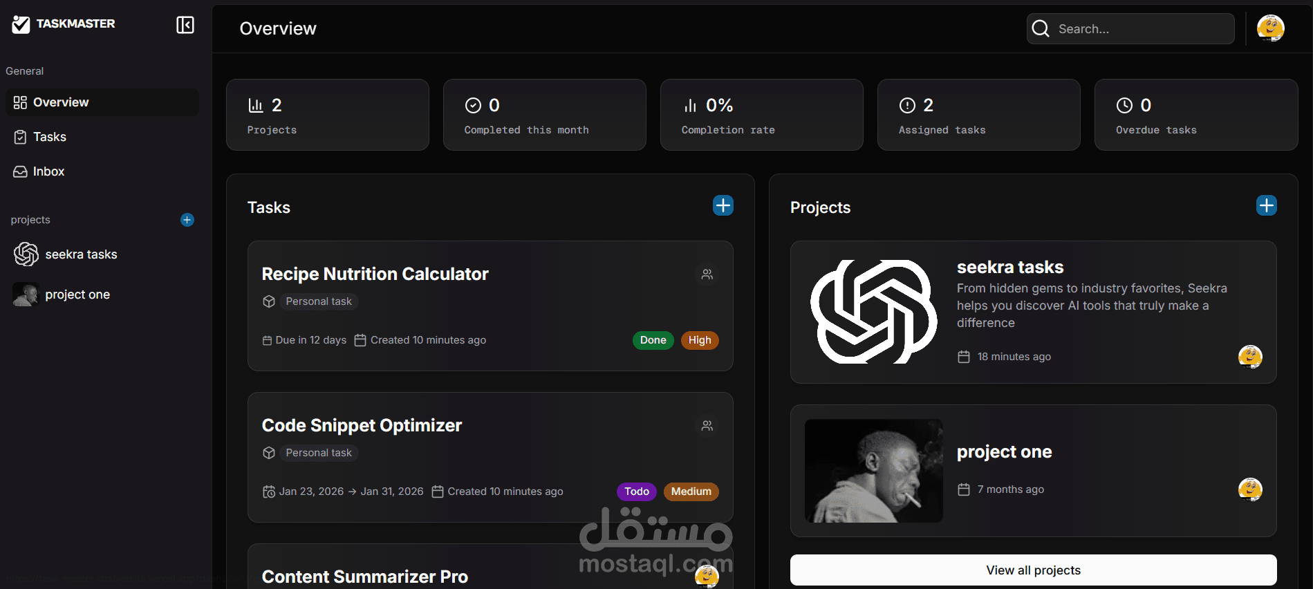 Task Master هو تطبيق حديث لإدارة المهام والمشاريع، مصمم لمساعدة الأفراد والفرق على تنظيم أعمالهم وزيادة إنتاجيتهم. يوفر بيئة عمل منظمة تربط بين المشاريع، الأعضاء، والمهام، مع إمكانية إنشاء مهام مستقلة لإدارة الأعمال الشخصية.