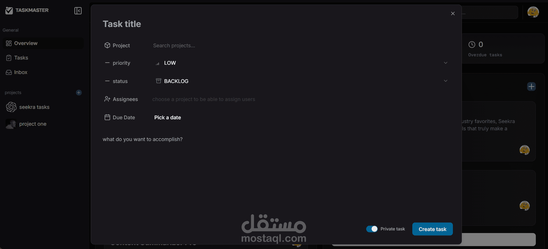 سواء كنت تدير مشروعًا لفريق عمل أو تنظم مهامك اليومية، يمنحك Task Master نظامًا متكاملًا لتخطيط وتنفيذ أعمالك بكل سهولة.
