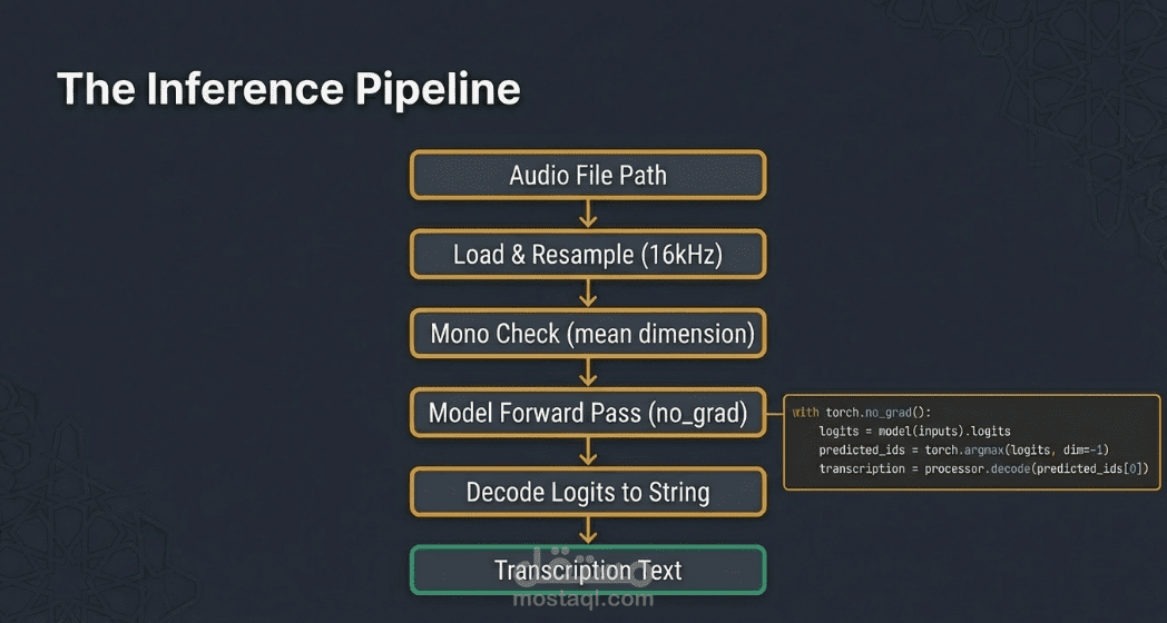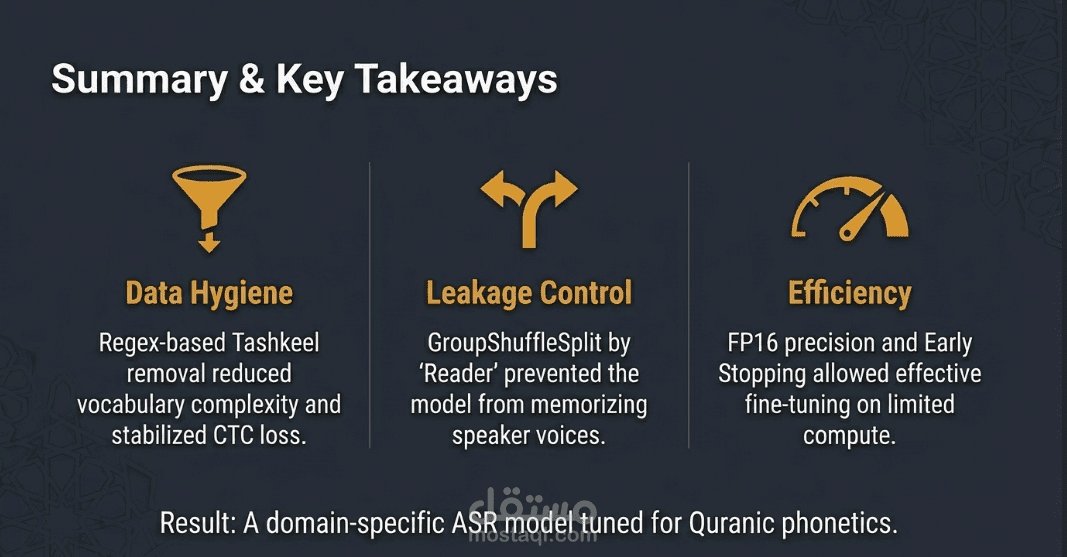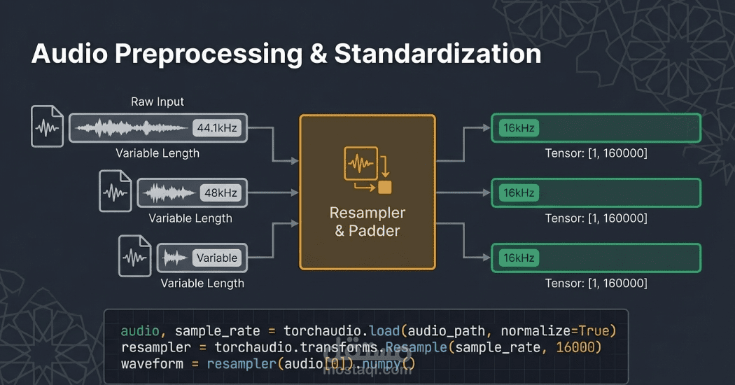 • المعالجة الصوتية القياسية: تحويل كافة الملفات الصوتية إلى تردد 16 كيلو هرتز (Resampling) لضمان توافقها التام مع متطلبات النموذج العالمي.