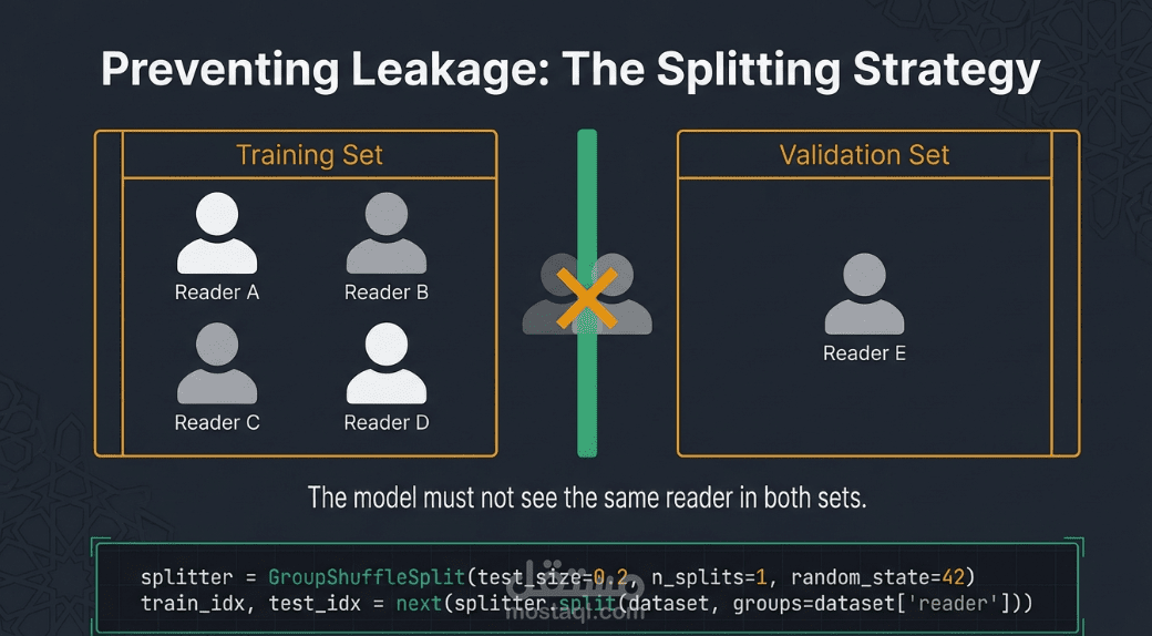 • التعميم عبر القراء: يتم تقسيم البيانات باستخدام تقنية GroupShuffleSplit بناءً على هوية القارئ، وهذا يضمن اختبار النموذج على أصوات قراء لم يسمعهم أبداً أثناء التدريب، مما يعزز من قدرته على العمل مع مختلف الأصوات