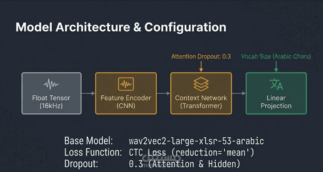 • المعالجة المسبقة (Preprocessing): استخدام Wav2Vec2Processor لتحويل الموجات الصوتية إلى قيم رقمية وتشفير النصوص المقابلة لها مع معالجة الحشو (Padding) لتوحيد أطوال المدخلات.