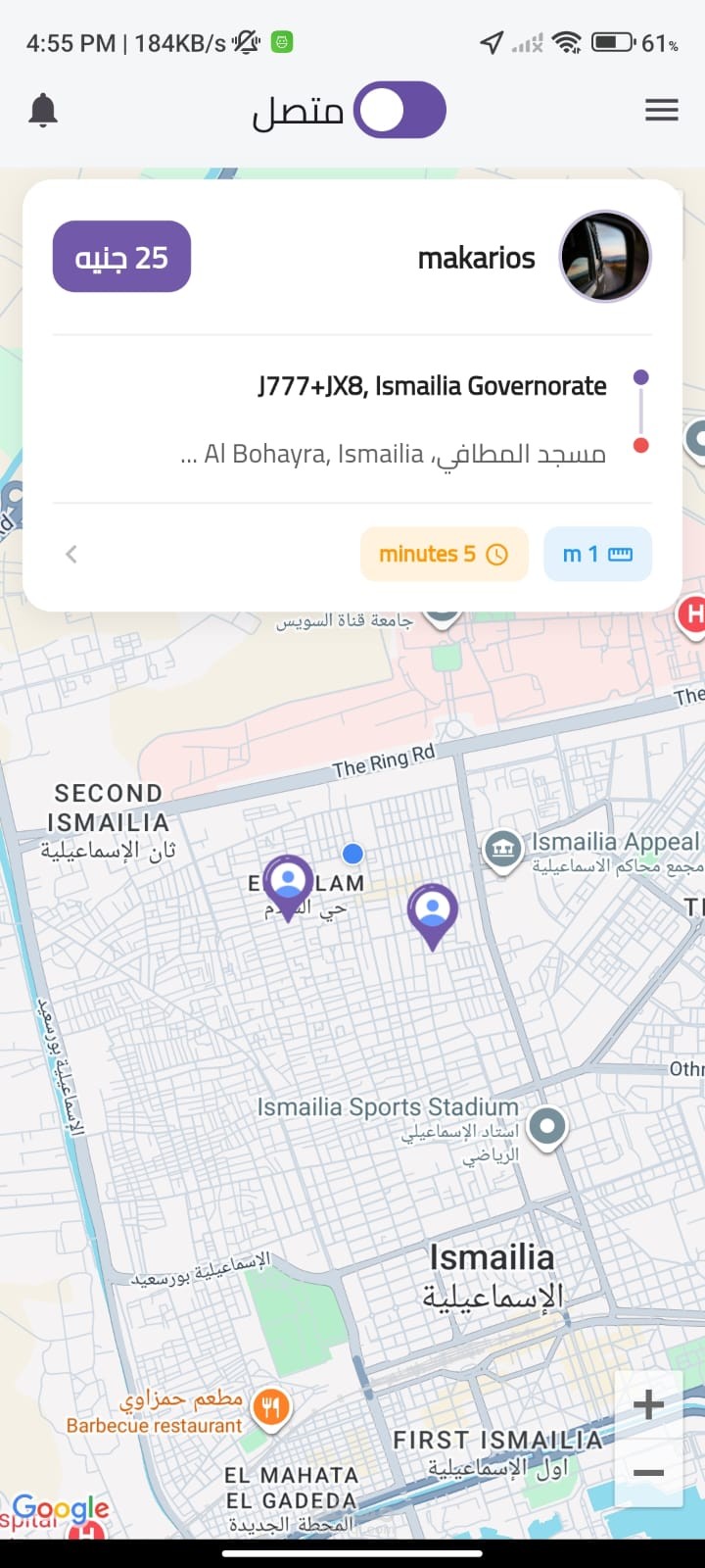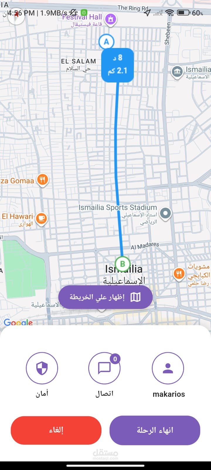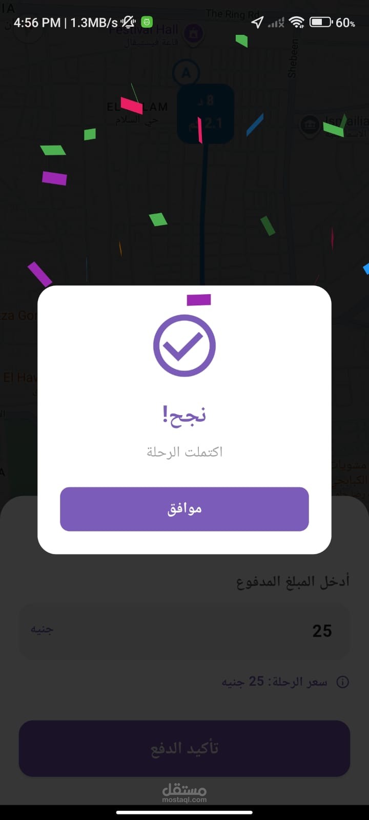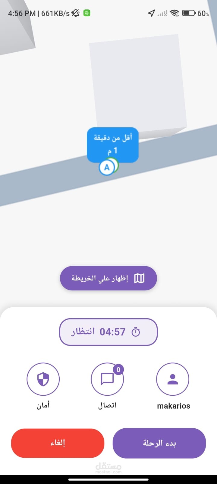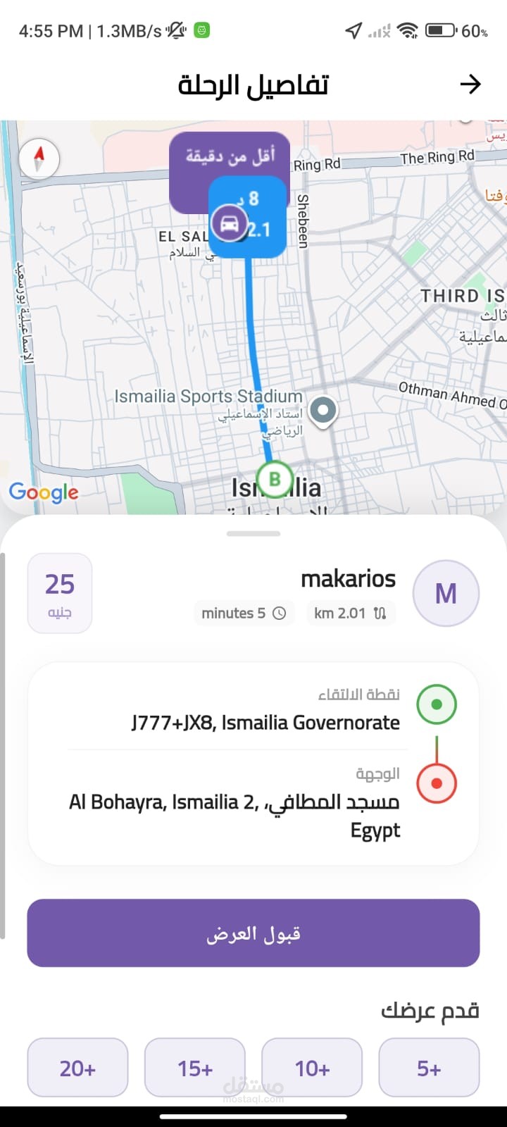 عرض تفاصيل الطلب (موقع العميل – نقطة الوصول – قيمة الرحلة).