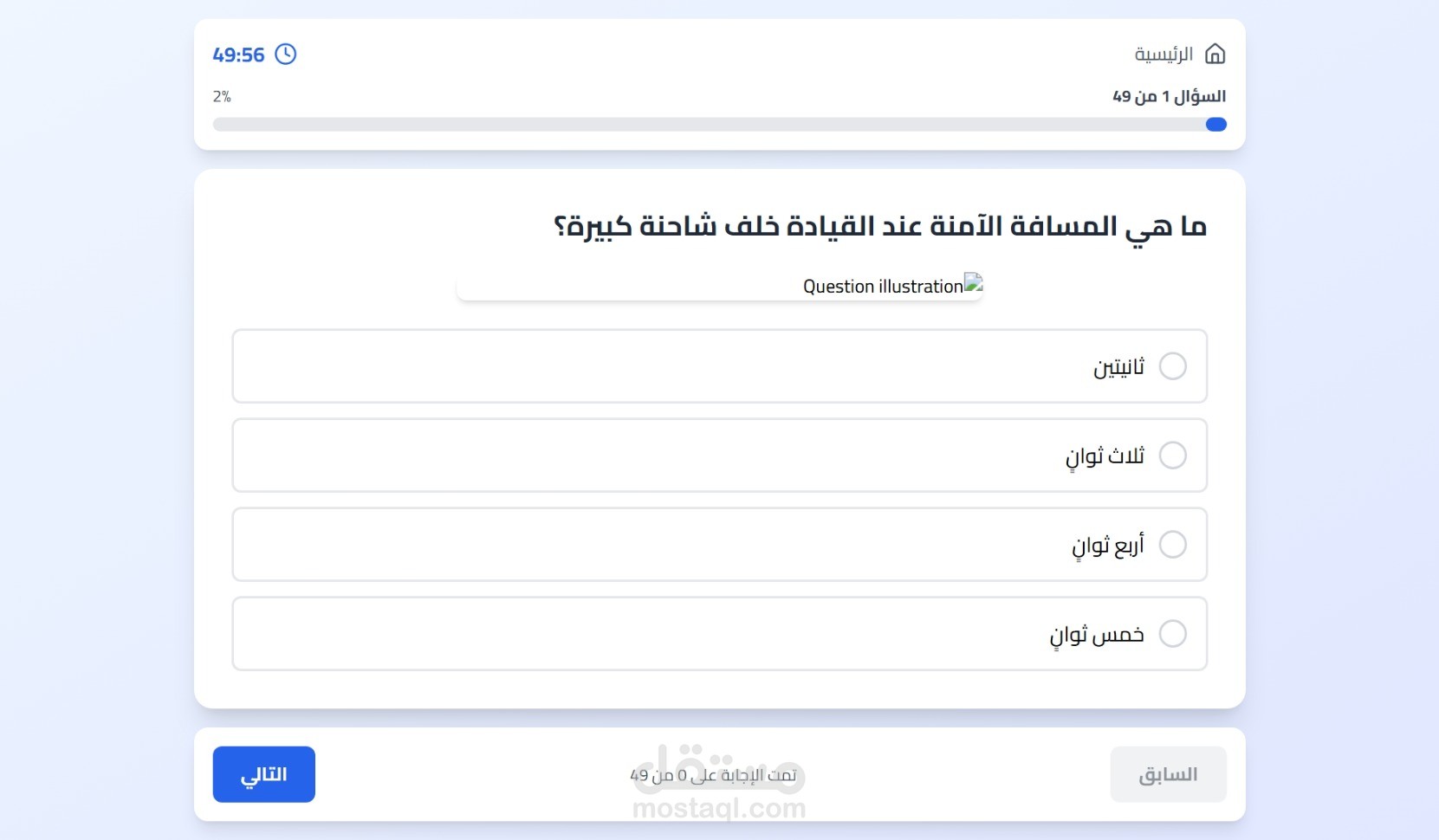 تجربة مستخدم تفاعلية (Interactive UX): واجهة واضحة تدعم "شريط التقدم" (Progress Bar) ومؤقت زمني لإدارة الوقت بكفاءة أثناء الاختبار.