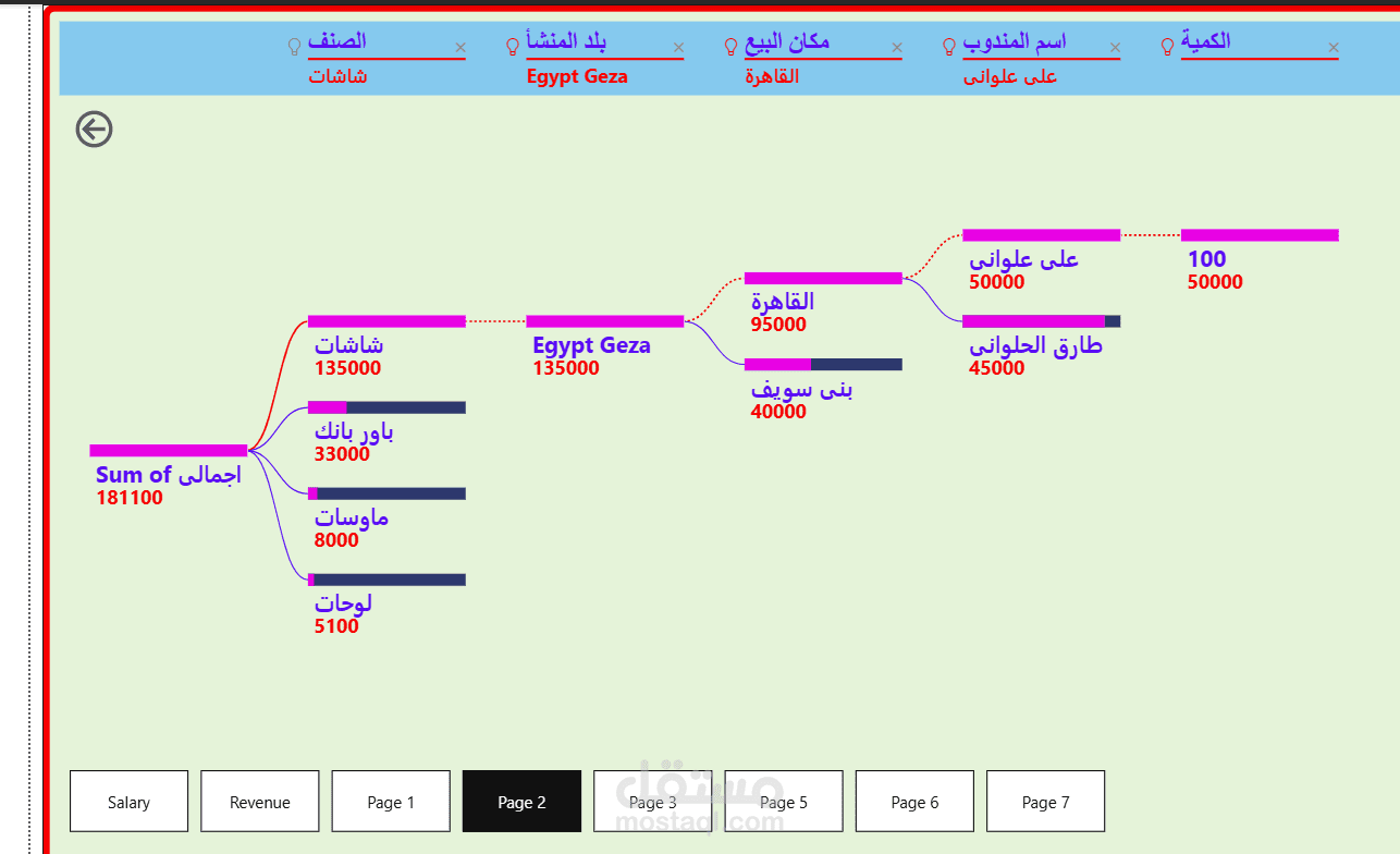 تحليل أداء المبيعات وتصميم لوحة تحكم تفاعلية هرمية توضح حركة المبيعات من الإجمالي حتى أدق مستوى (الصنف ← البلد ← المحافظة ← المندوب ← الكمية/القيمة).