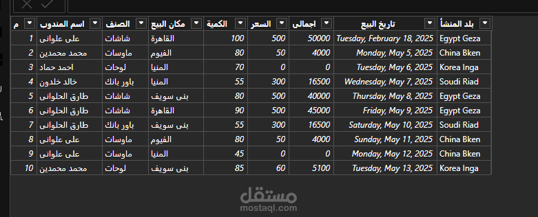 تحليل المبيعات حسب الصنف، البلد، المحافظة، والمندوب
