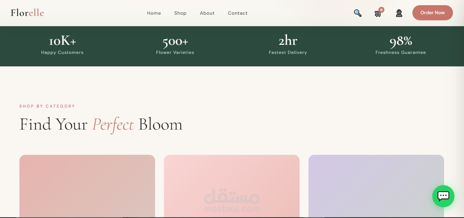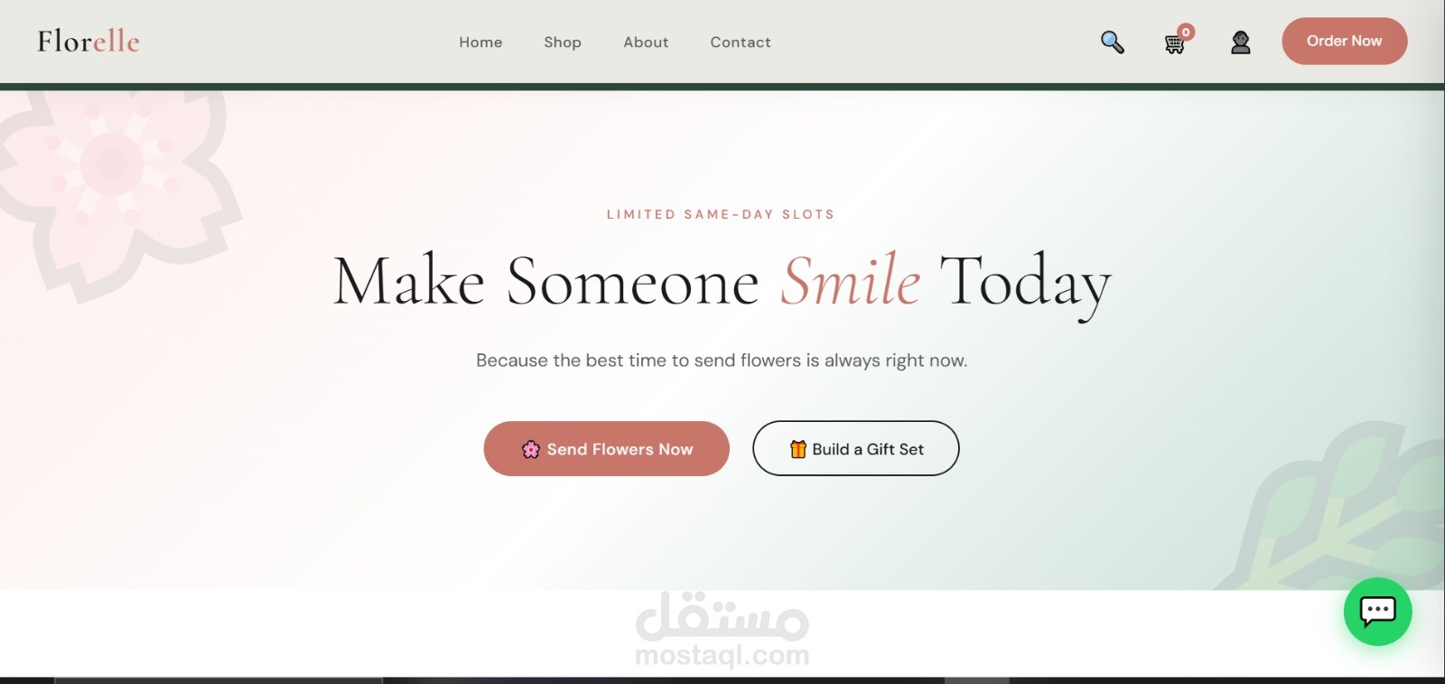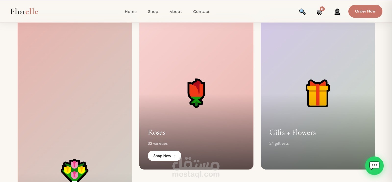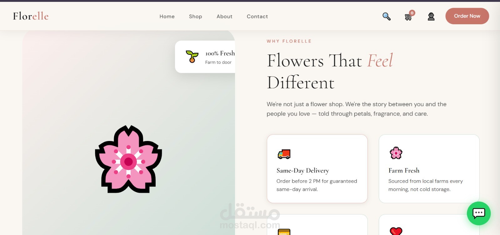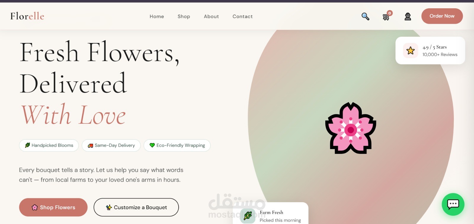موقع إلكتروني احترافي لبيع وتوصيل الزهور بتصميم عصري وهادئ يركز على إبراز المنتج وتجربة المستخدم. الصفحة الرئيسية مصممة بأسلوب جذاب يعكس الإحساس بالحب والاهتمام بالتفاصيل، مع واجهة بسيطة وسهلة الاستخدام.