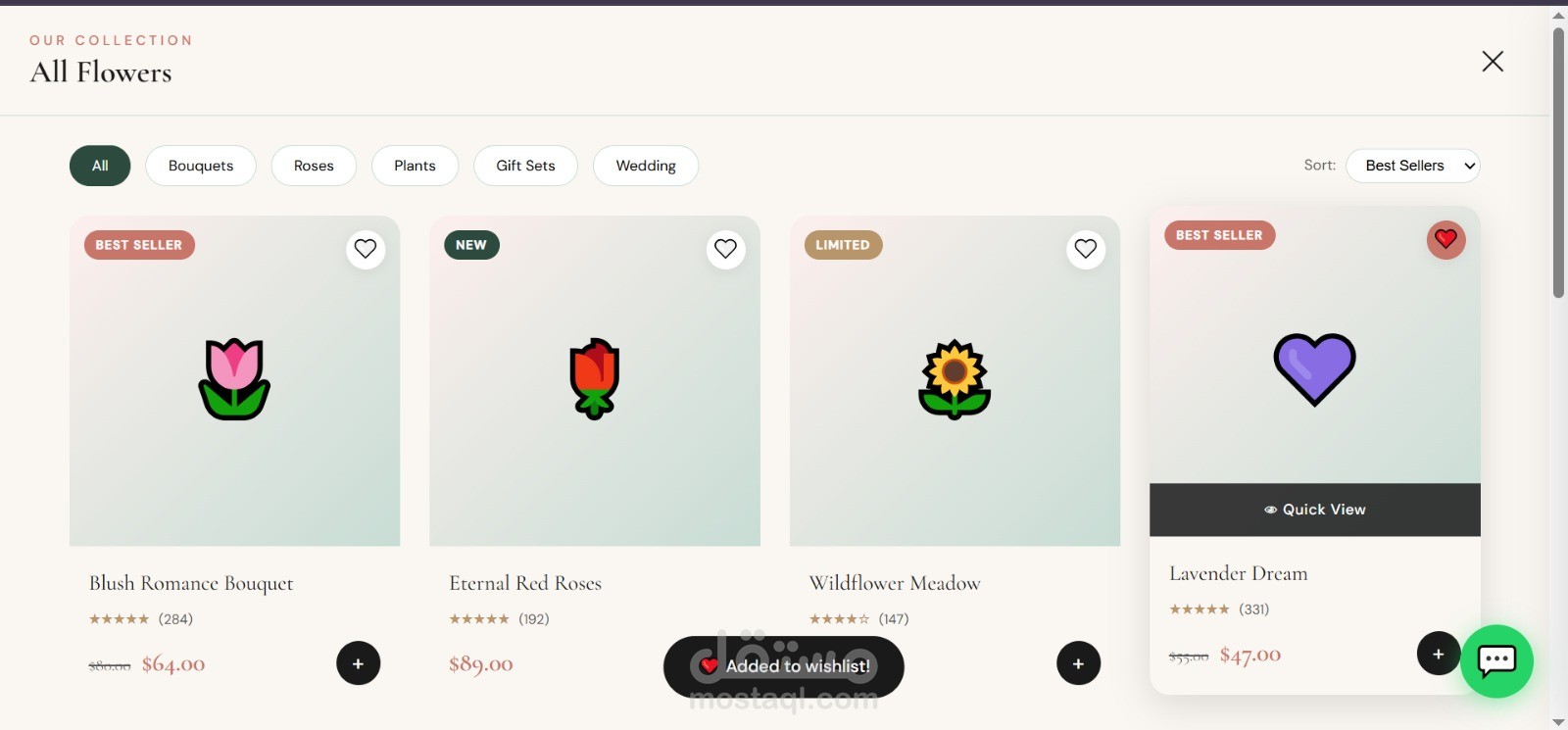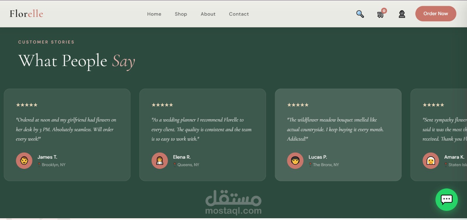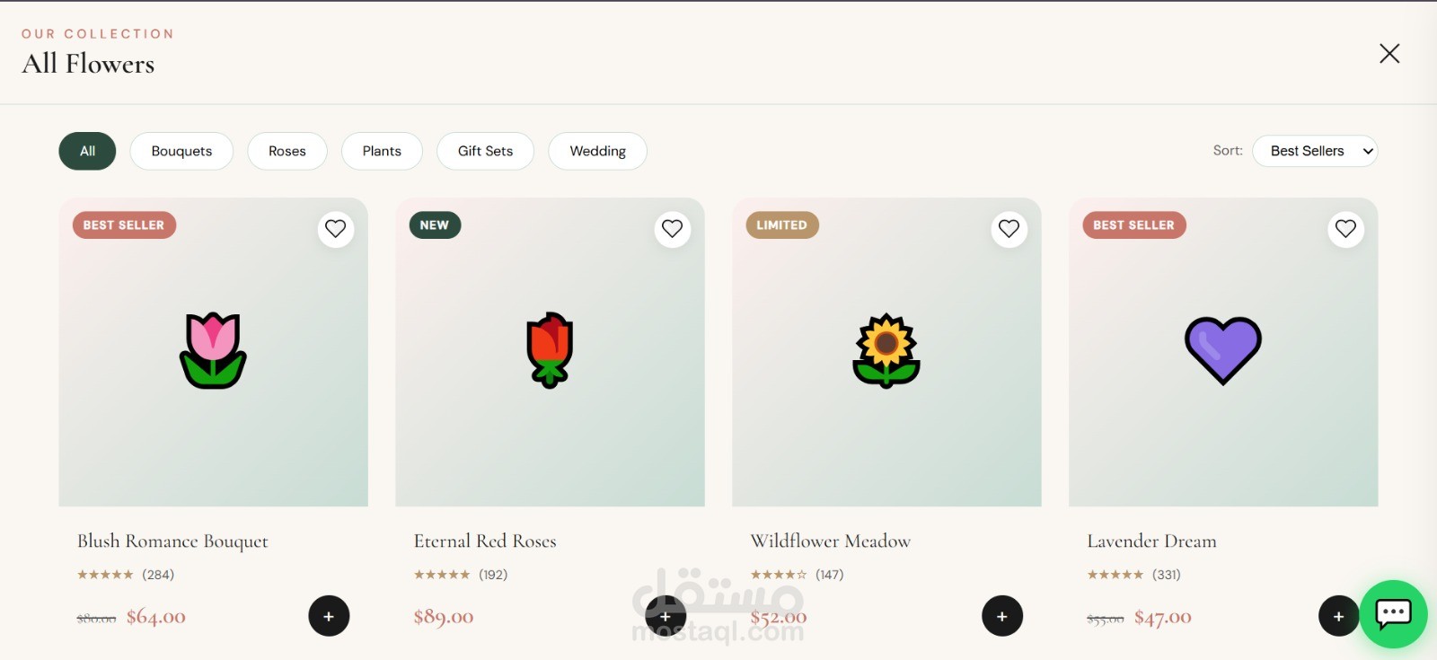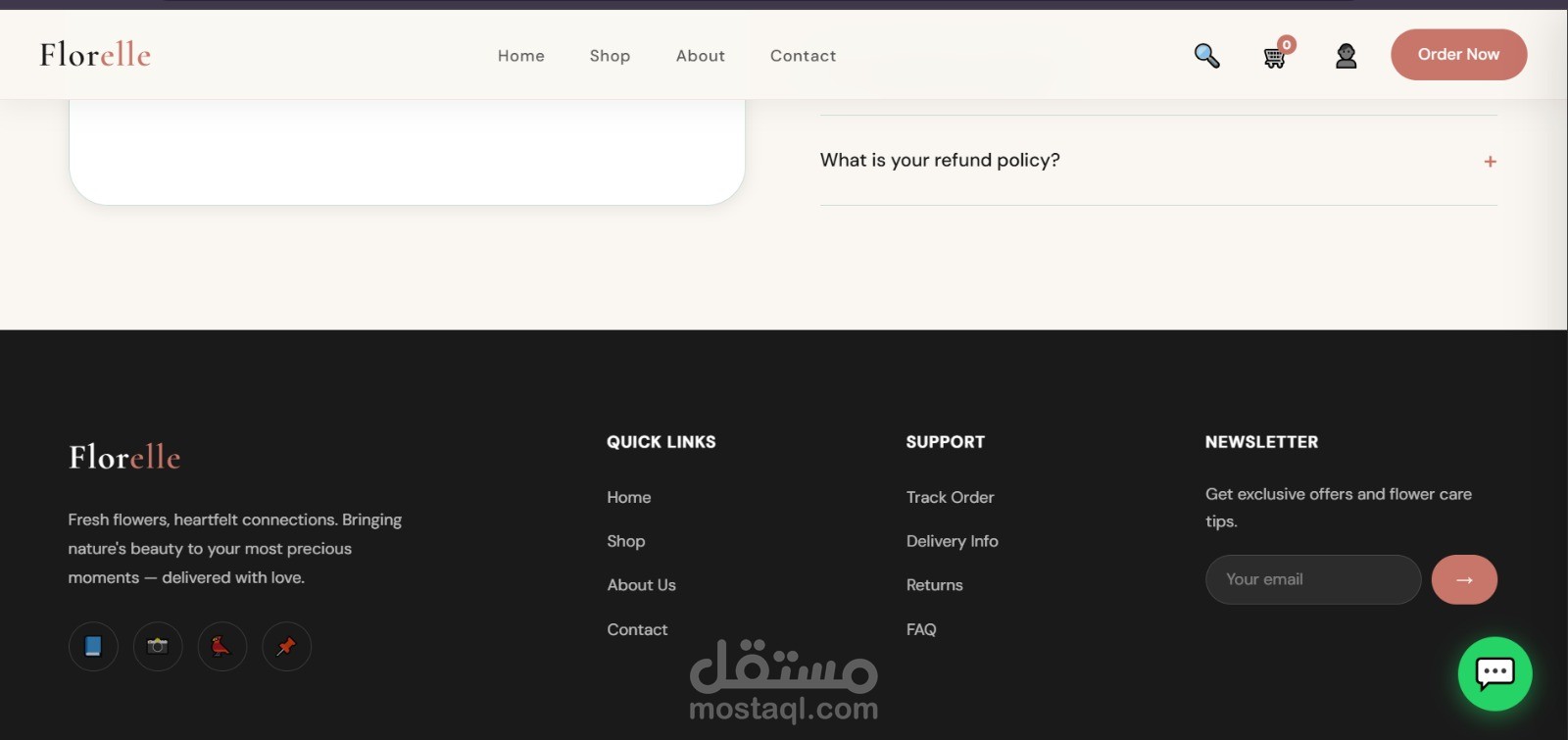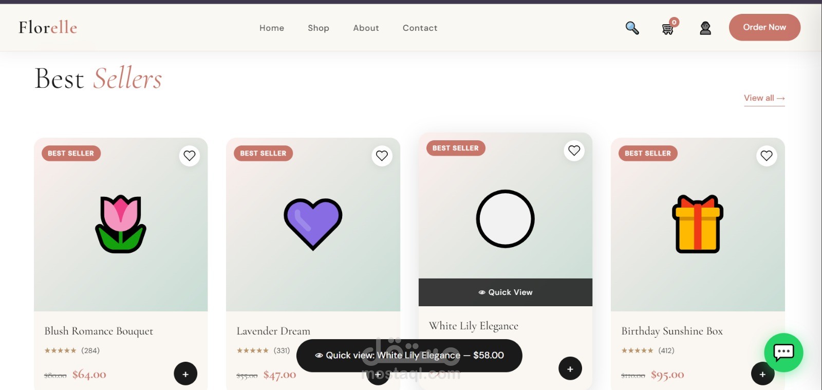 موقع إلكتروني احترافي لبيع وتوصيل الزهور بتصميم عصري وهادئ يركز على إبراز المنتج وتجربة المستخدم. الصفحة الرئيسية مصممة بأسلوب جذاب يعكس الإحساس بالحب والاهتمام بالتفاصيل، مع واجهة بسيطة وسهلة الاستخدام.