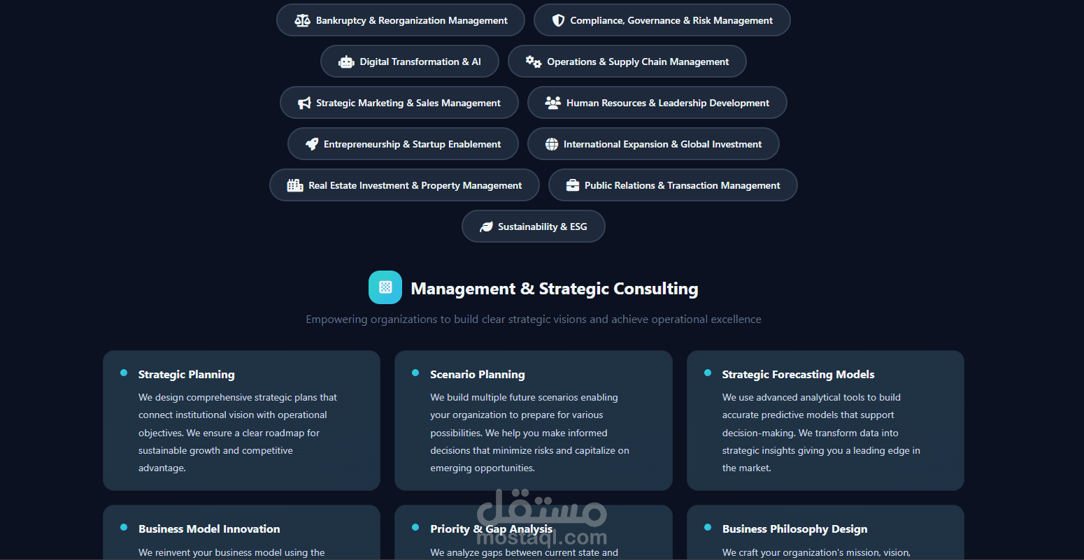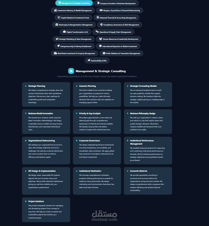 يعرض الموقع خدمات تحليل الفرص الاستثمارية، إعداد دراسات الجدوى، التخطيط المالي، تقييم المخاطر، وبناء الاستراتيجيات طويلة المدى، مع تقديم حلول عملية مبنية على بيانات دقيقة ورؤية تحليلية واضحة.