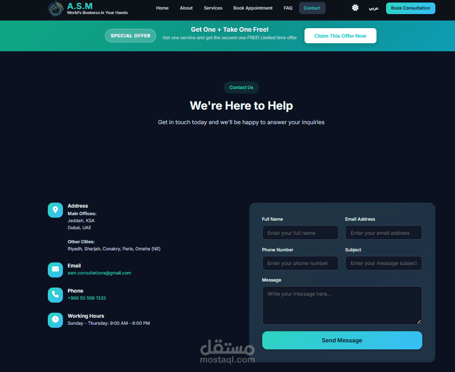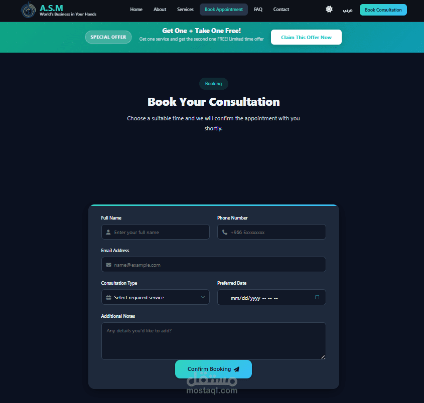 تم تطوير الموقع باستخدام Vanilla JavaScript , الموقع يدعم اللغتين العربية والإنجليزية مع تحويل تلقائي لاتجاه الصفحة (RTL/LTR)، بالإضافة إلى وضع ليلي (Dark Mode) لتحسين تجربة التصفح. تم تصميمه بهيكل منظم قابل للتوسع، مع تقسيم ذكي للأكواد وتحميل كسول للملفات لتحسين الأداء والحفاظ على نتائج مرتفعة في اختبارات السرعة مثل Lighthouse.