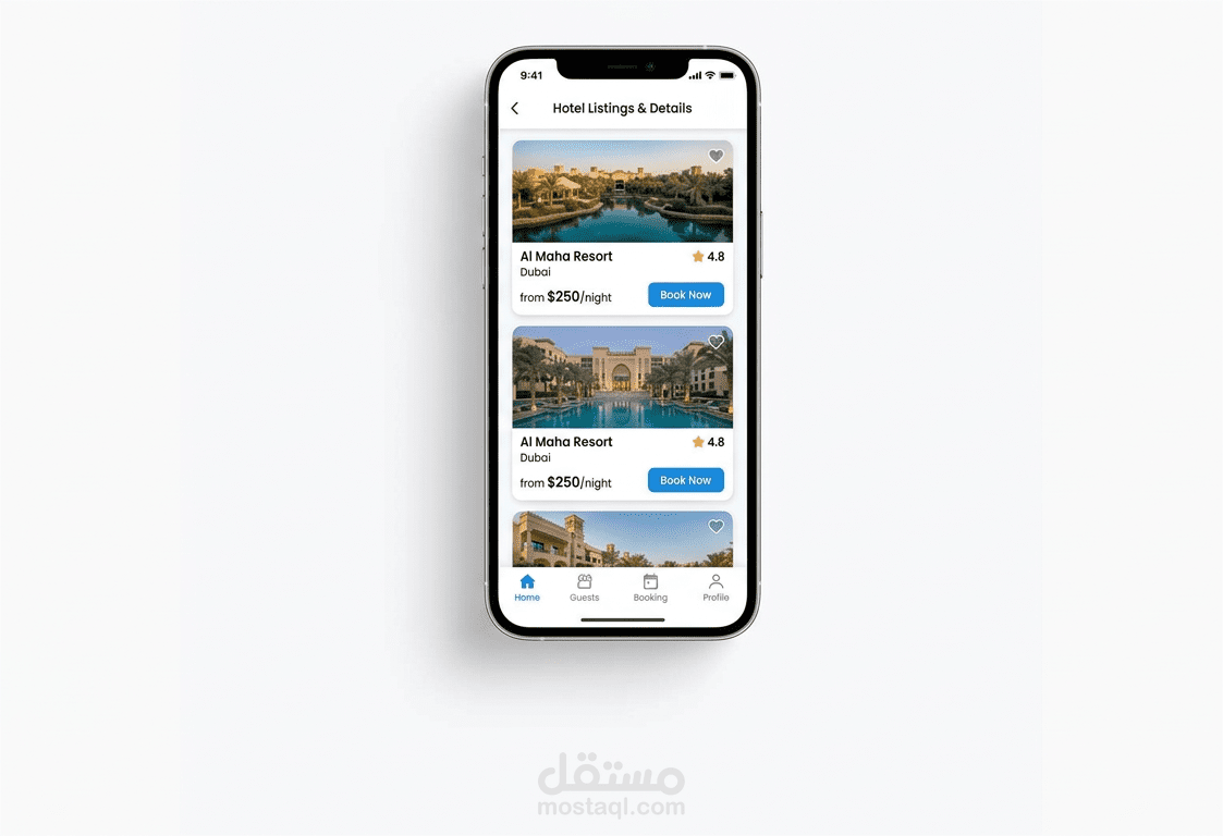 طوّرنا تطبيقًا متطورًا للهواتف المحمولة لمجموعة إدارة فنادق، بهدف تبسيط عملية الحجز. كان الهدف تزويد المستخدمين بمنصة سريعة وموثوقة لتصفح الفنادق، والتحقق من التوافر في الوقت الفعلي، وتأكيد الحجوزات فورًا.