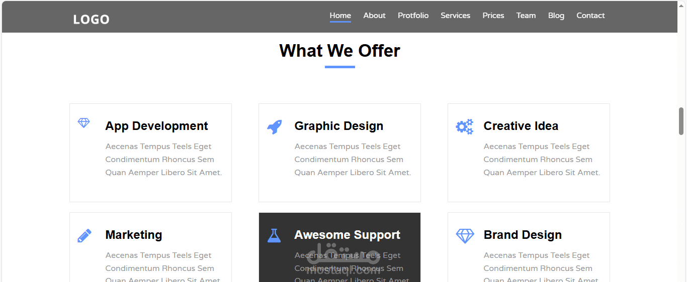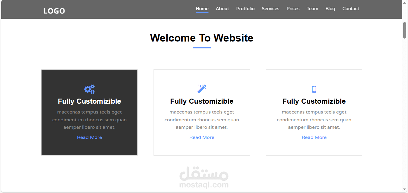 يتضمن الموقع صفحة رئيسية تحتوي على قسم تعريفي (Hero Section)، وقائمة تنقل علوية، وأقسام للخدمات والمميزات والعروض، مع تصميم بطاقات (Cards) لعرض المحتوى بشكل واضح، بالإضافة إلى تخطيط متجاوب (Responsive) يعمل بكفاءة على جميع أحجام الشاشات.