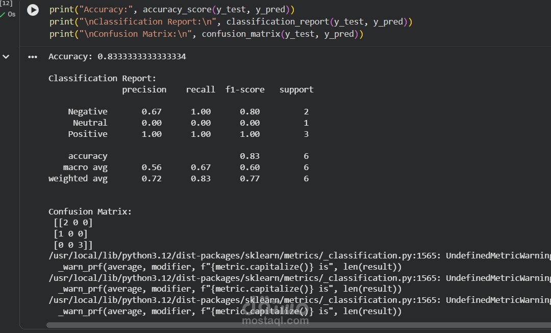 تقييم النموذج باستخدام Accuracy / F1 Score / Confusion Matrix.
