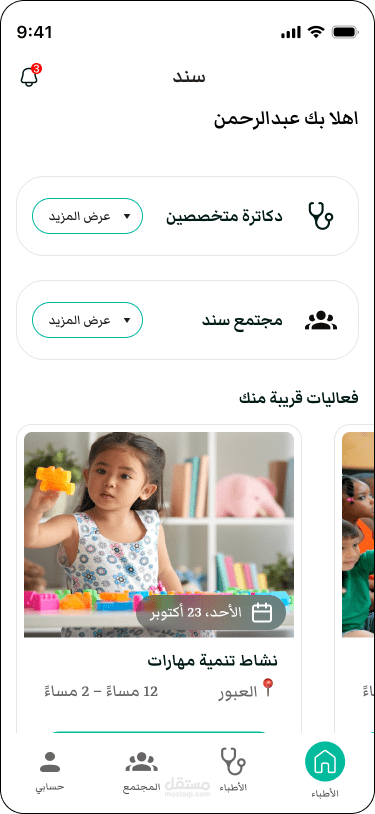 قمت بتصميم تجربة وواجهة مستخدم (UI/UX) لتطبيق سند، وهو منصة رقمية تربط الأهالي بالأخصائيين والأطباء المتخصصين في مجالات مثل علاج النطق والتوحد والرعاية التنموية.