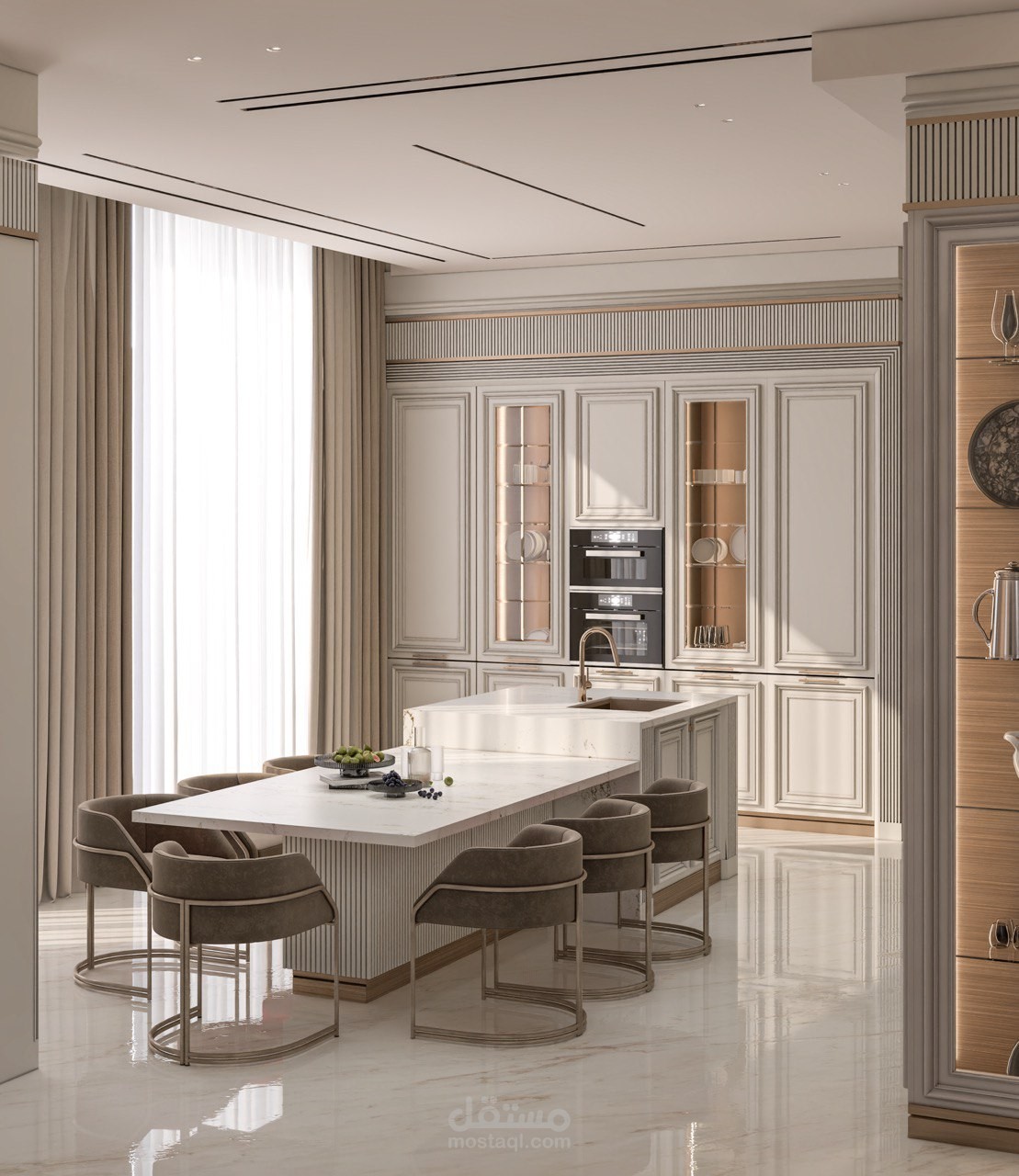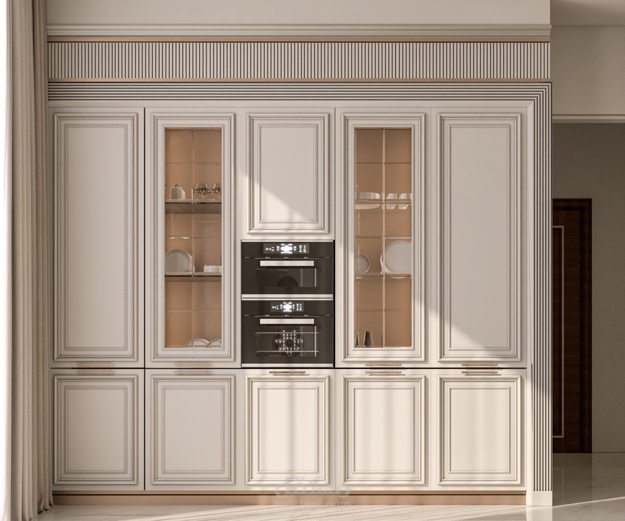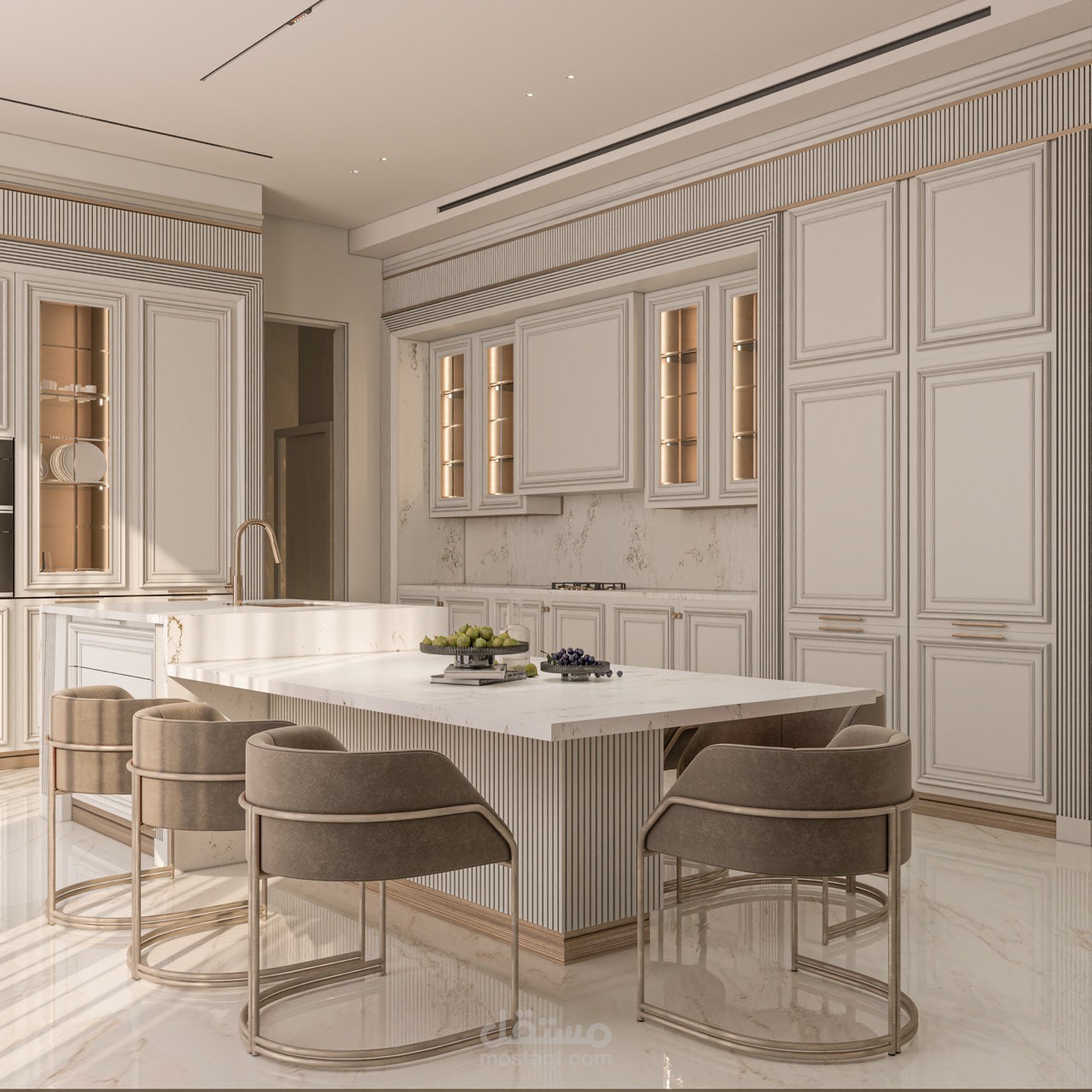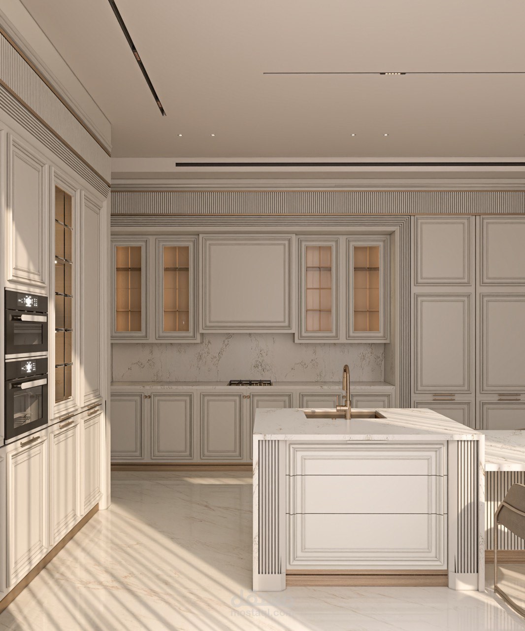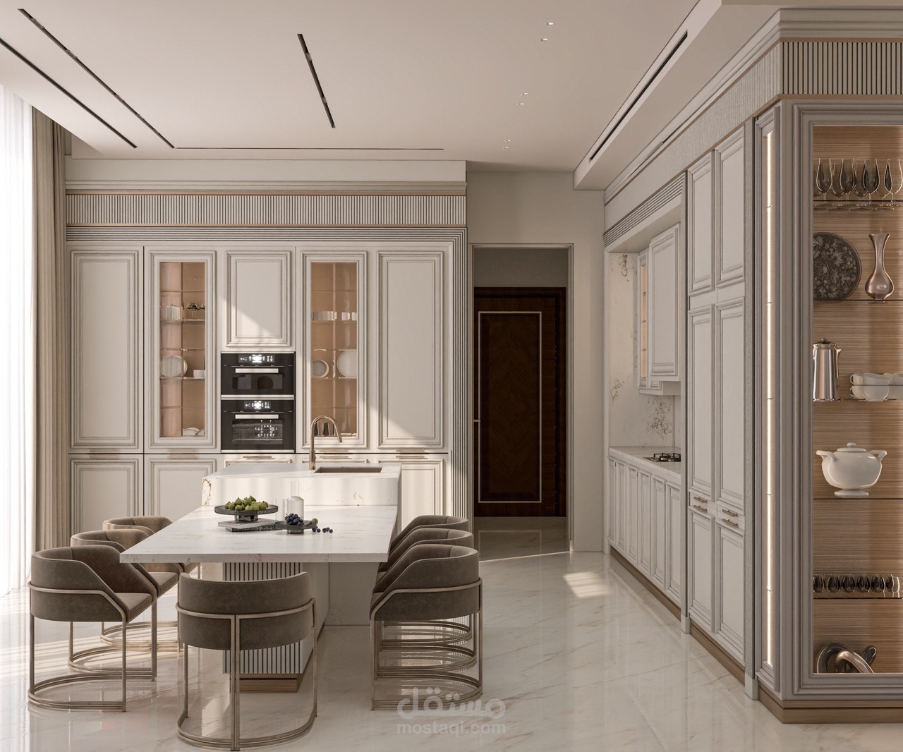تصميم مطبخ عرض بأسلوب النيو كلاسيك يجمع بين فخامة التفاصيل الكلاسيكية وأناقة الخطوط العصرية، ليقدم مساحة متوازنة تنبض بالرقي والدفء. تم اعتماد لوحة ألوان هادئة تعزز الإحساس بالفخامة، مع إبراز الإكسسوارات الذهبية كعنصر جمالي راقٍ يضيف لمسة ملكية للمشهد العام.