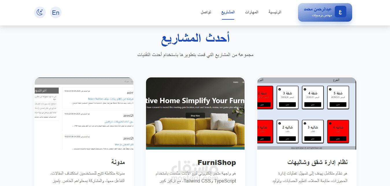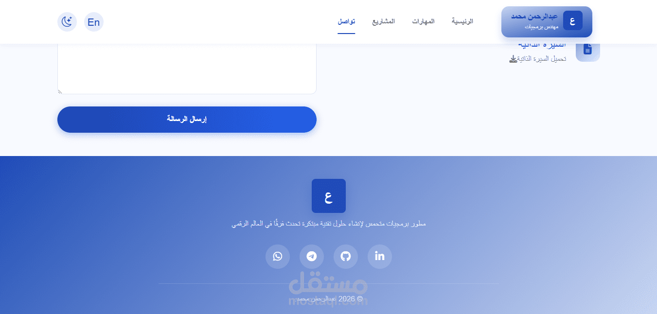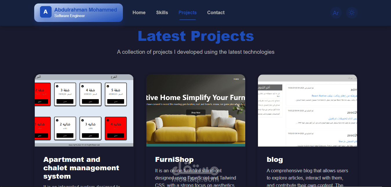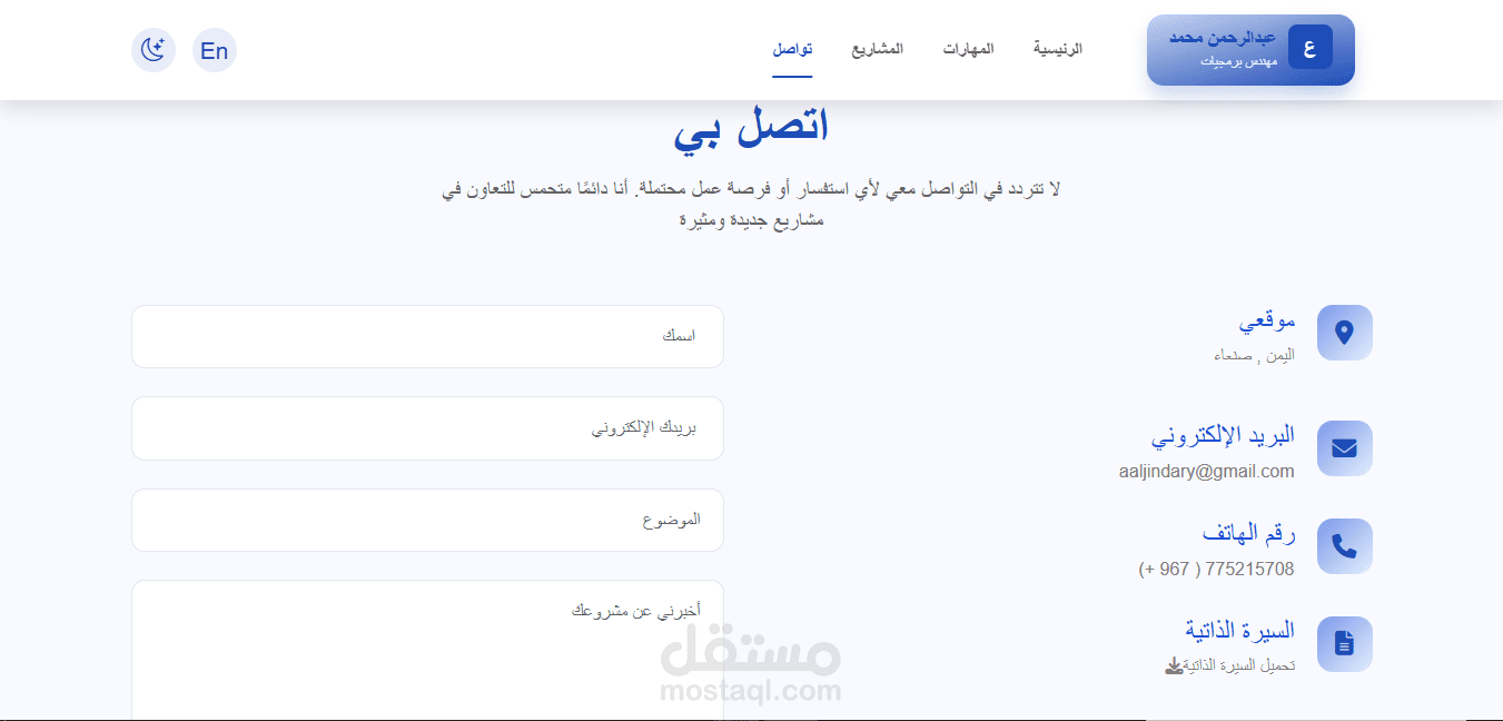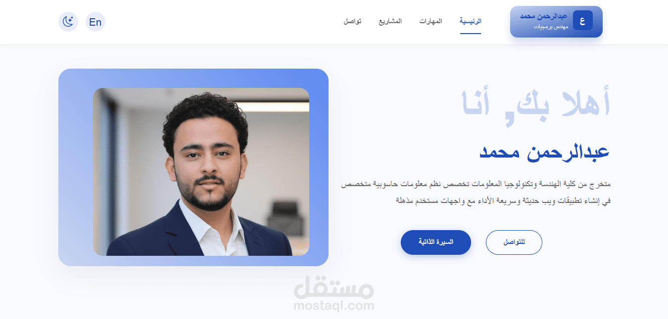 موقع شخصي يعرض أعمالي ومشاريعي بطريقة احترافية، مع دعم كامل للغتين العربية والإنجليزية، ولوحة تحكم تمكنني من إدارة المحتوى بكل سهولة