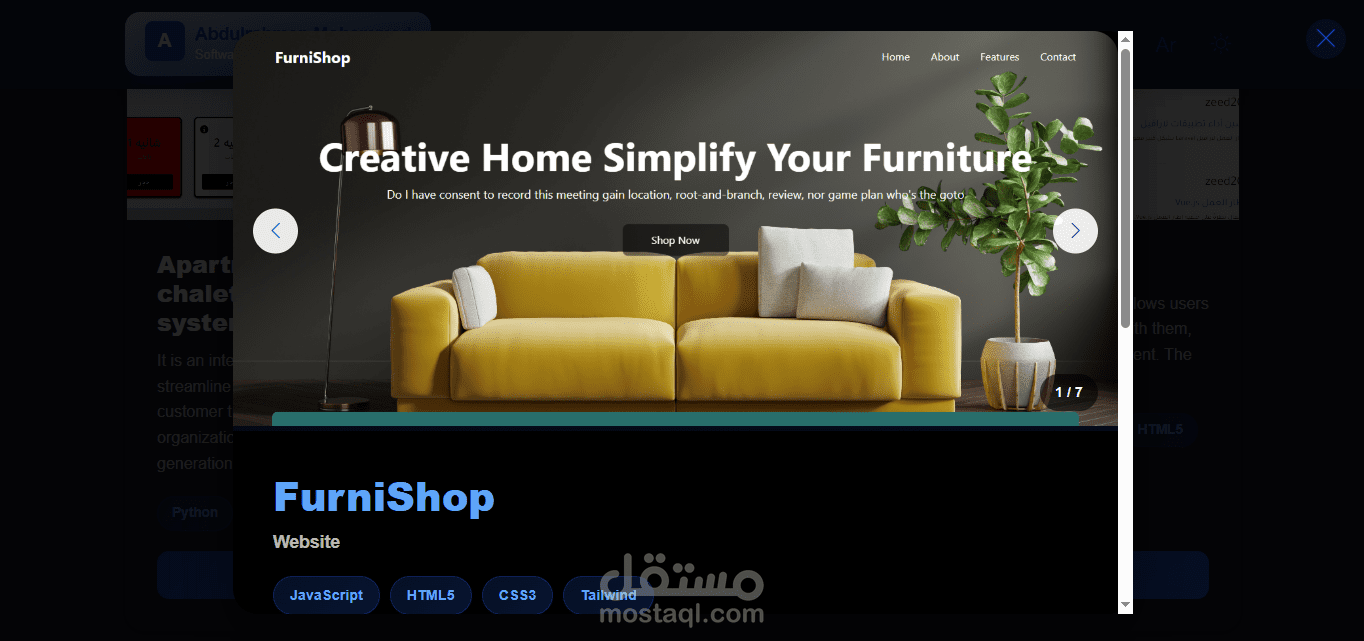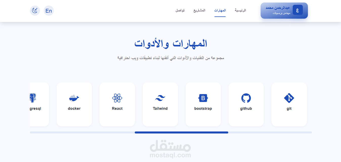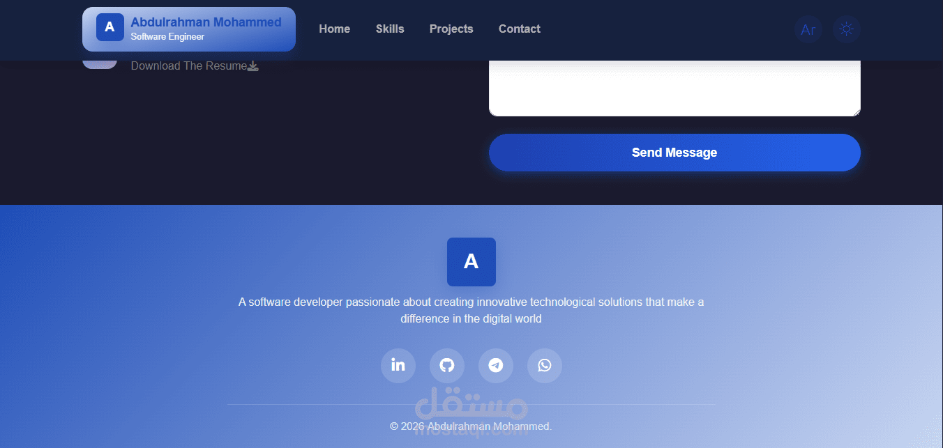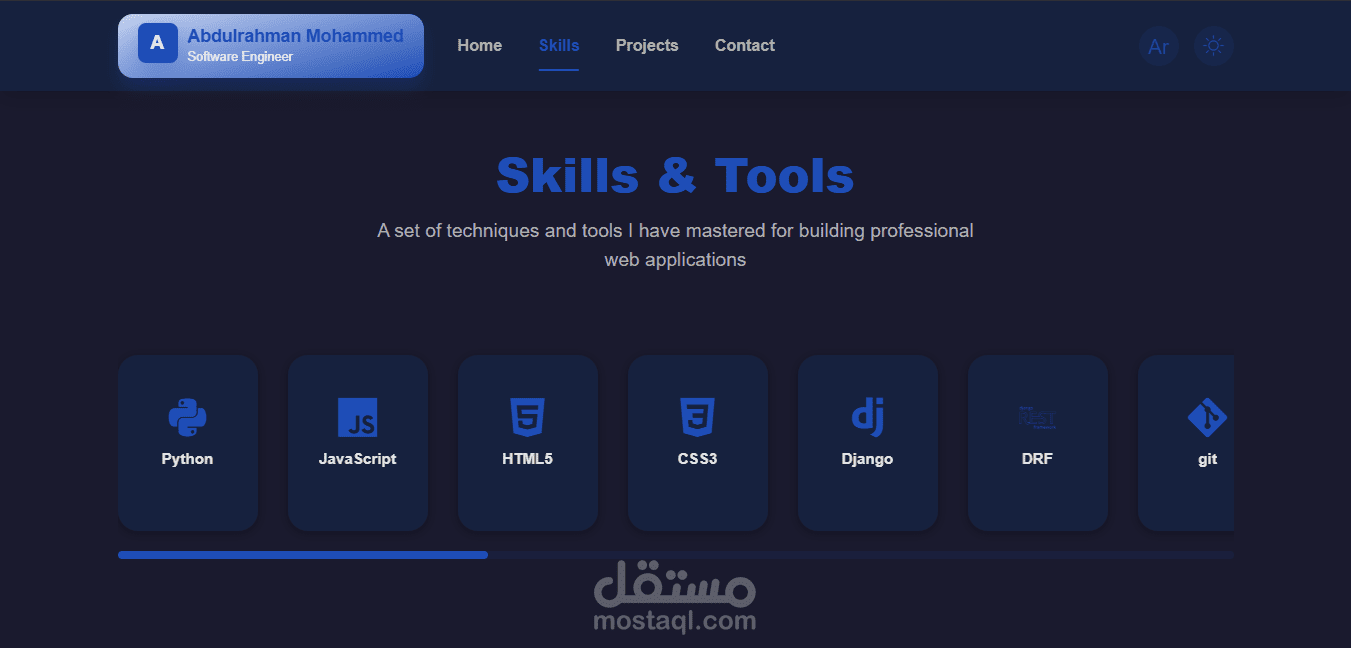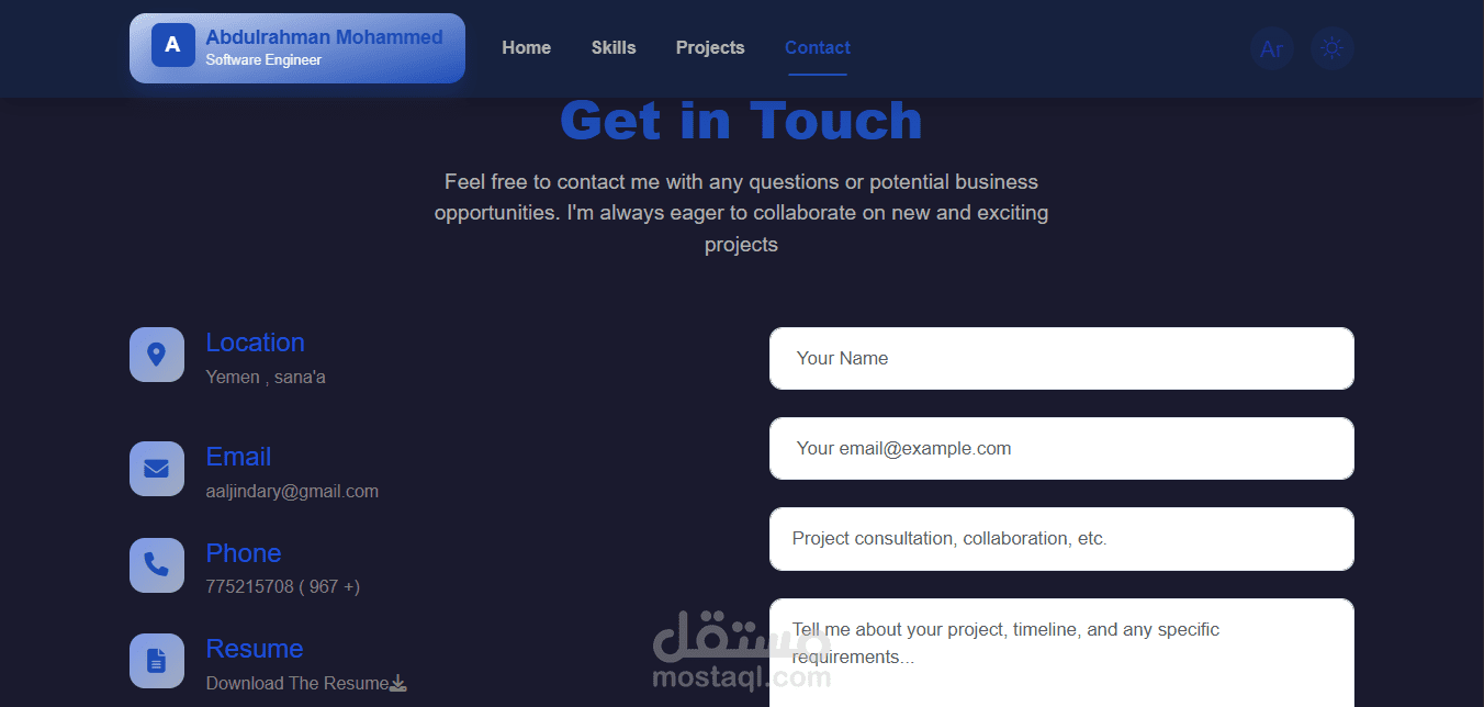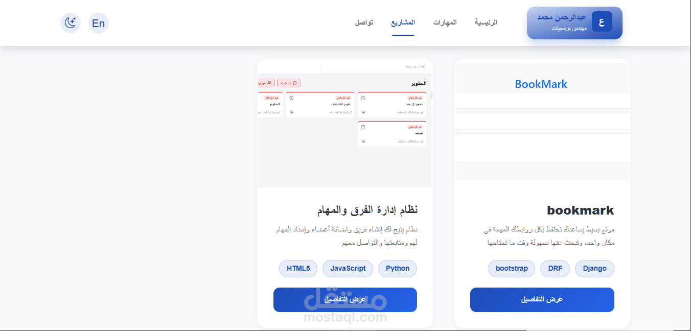 موقع شخصي يعرض أعمالي ومشاريعي بطريقة احترافية، مع دعم كامل للغتين العربية والإنجليزية، ولوحة تحكم تمكنني من إدارة المحتوى بكل سهولة