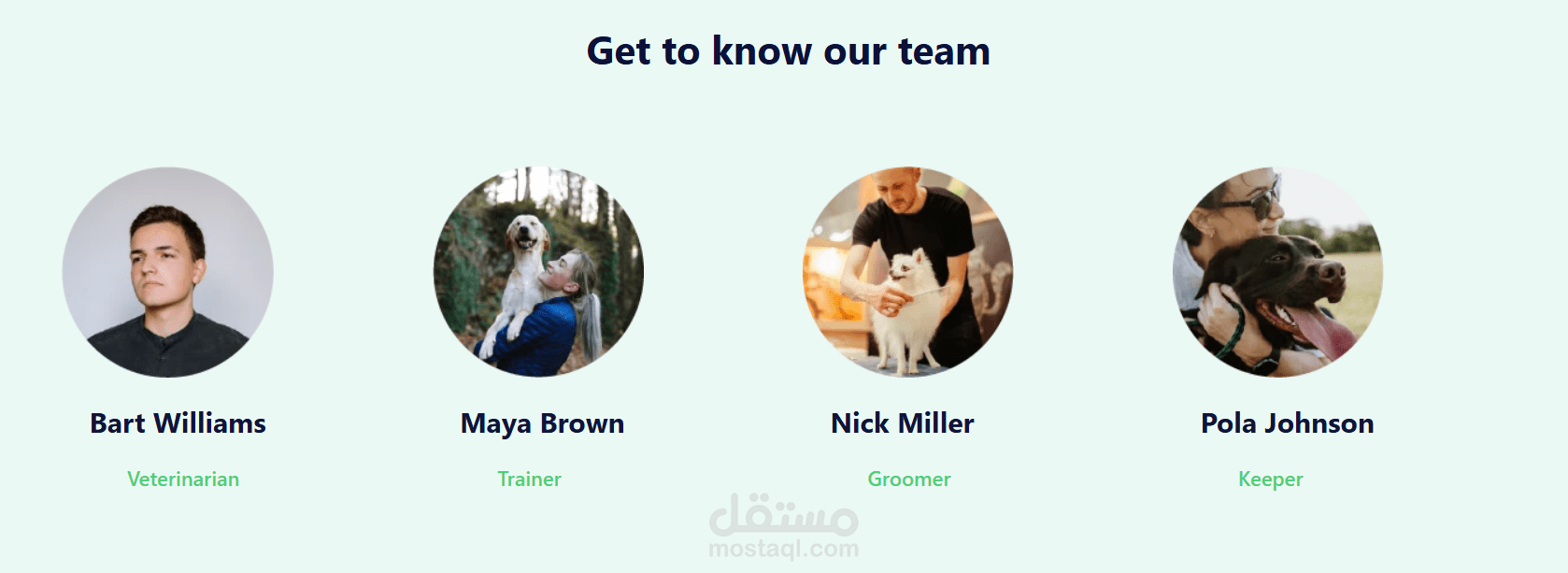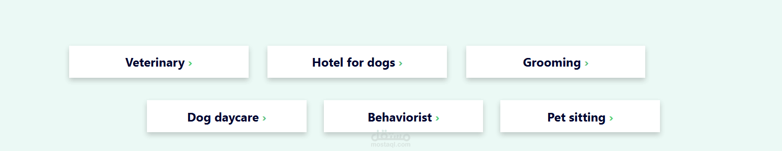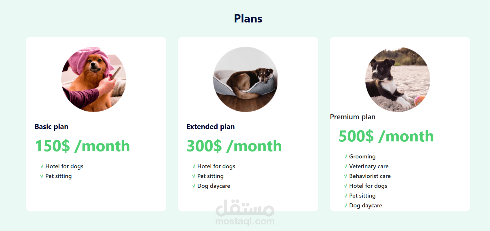 قسم الخدمات (Services): مقسم بشكل ممتاز لمربعات بتعرض أنواع الرعاية (رعاية طبية، تدريب، تمشية الكلاب، إلخ).