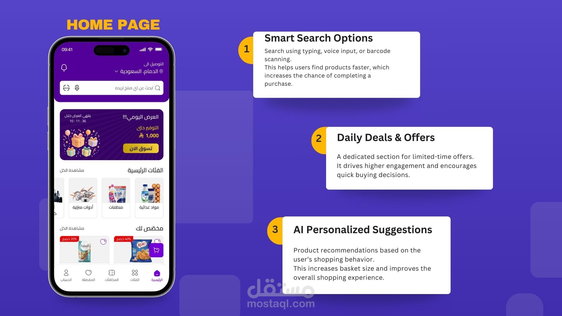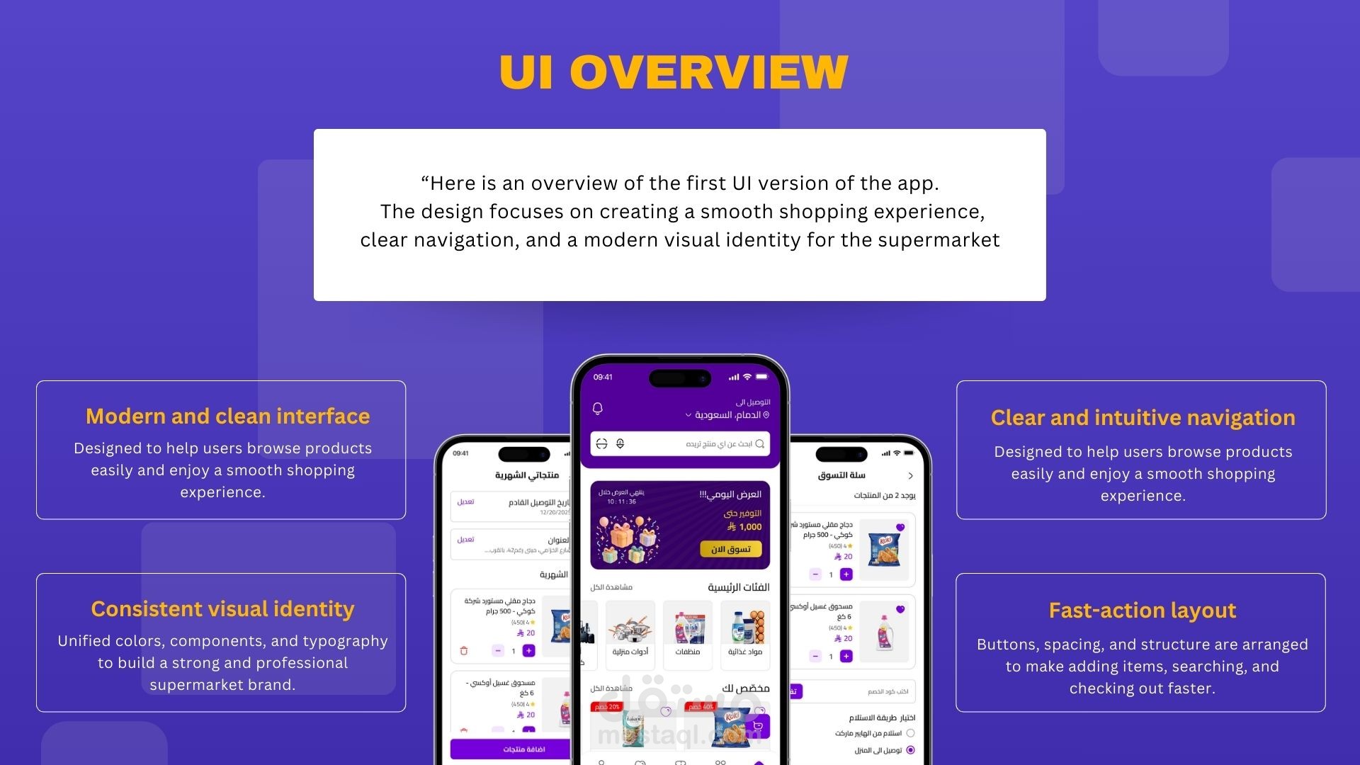 خلال المشروع شاركت في العمل على فهم احتياجات المستخدمين وتحليل تجربة التسوق داخل السوبر ماركت الإلكتروني، ثم المساهمة في تصميم هيكل التطبيق وتنظيم رحلة المستخدم داخل الصفحات، بهدف تسهيل عملية البحث عن المنتجات والوصول إليها بسرعة.