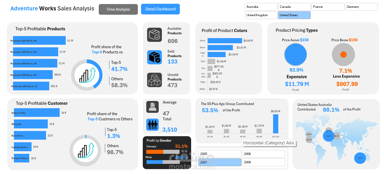 عملت لوحتين تفاعليتين عشان أحلل مبيعات Adventure Works باستخدام ميزات Excel المتقدمة. المشروع دا خلاني أدمج تنظيف البيانات، النمذجة، والتصور في حل كامل من الأول للآخر، وحولت البيانات الخام لرؤى مفيدة.