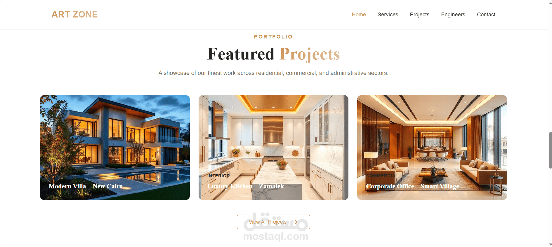 قمت بتصميم وتطوير موقع رسمي احترافي لشركة خدمات هندسية وديكور داخلي تحت اسم ART ZONE، يعكس هوية بصرية قوية ويعزز الثقة لدى العملاء.