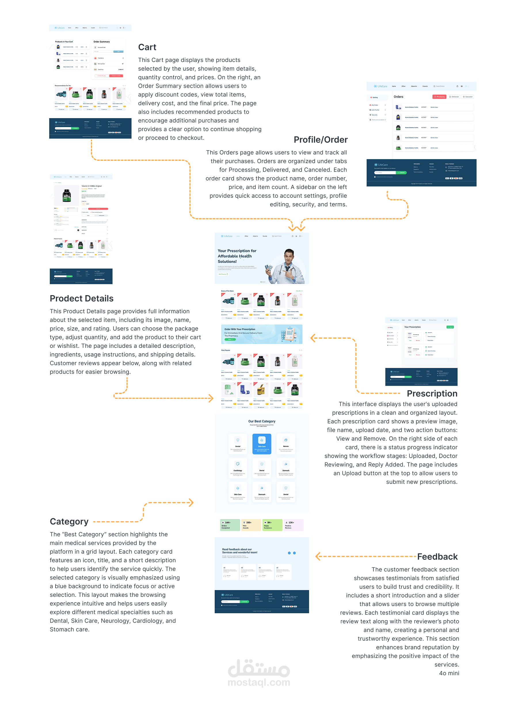 تم تصميم واجهات UI بأسلوب نظيف وبسيط يعكس الثقة المرتبطة بالمجال الطبي، مع تنظيم واضح للمحتوى ليتناسب مع تجربة الويب والموبايل.