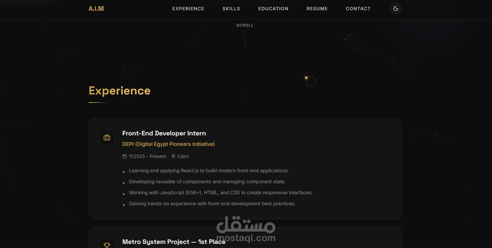 قمت بتنفيذ (Portfolio Website) باستخدام React.js بهدف عرض المهارات والخبرات والمشاريع بشكل احترافي وعصري.