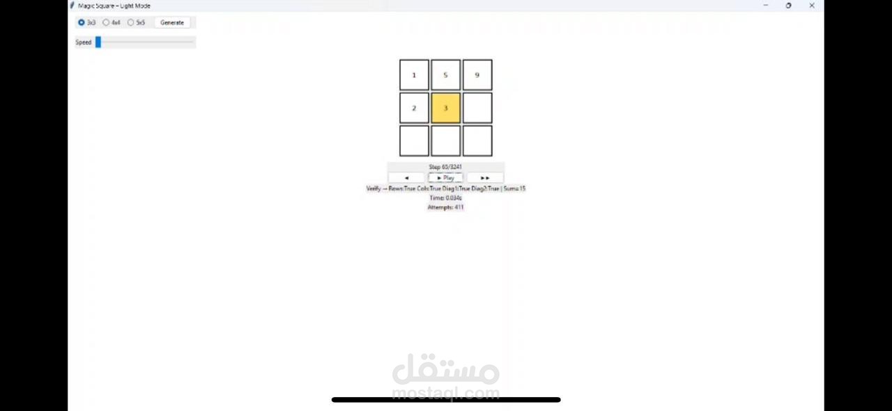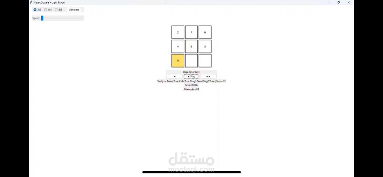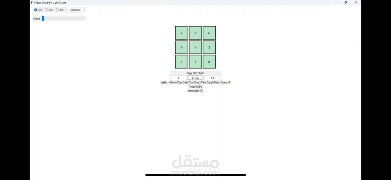 في هذا المشروع قمت بتطوير برنامج لحل Magic Square باستخدام لغة Python، حيث يقوم النظام بتوليد أو حل مربع سحري بحيث يكون مجموع الأرقام في كل صف وعمود وقطر متساوي.