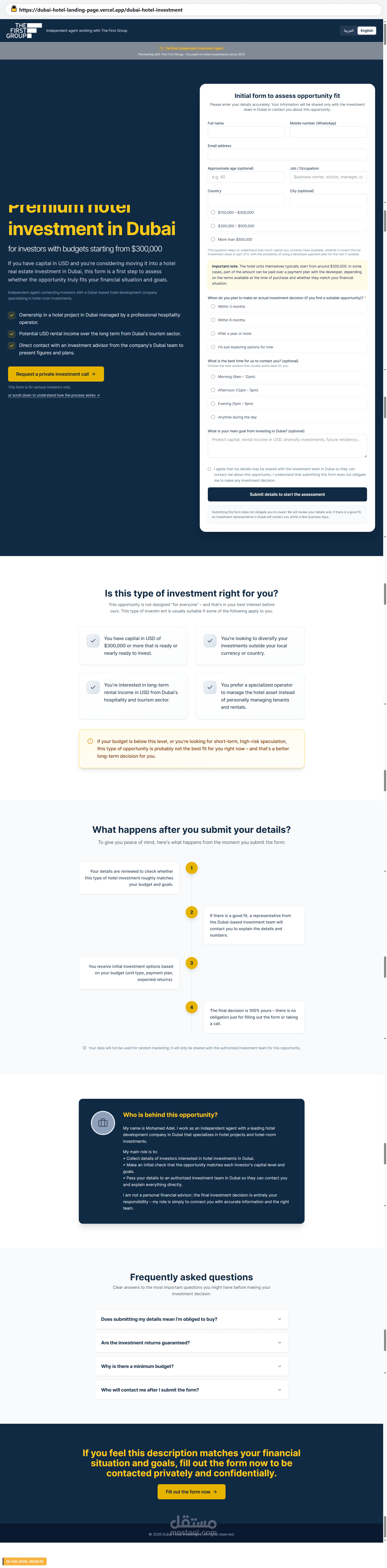 تصميم وتطوير قالب Landing Page قابل لإعادة الاستخدام لجلب عملاء للاستثمار الفندقي