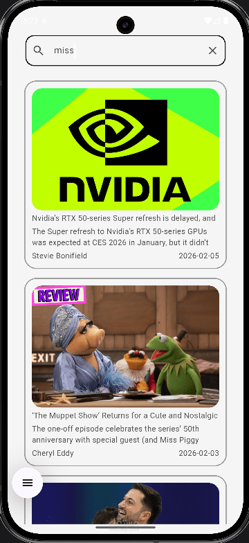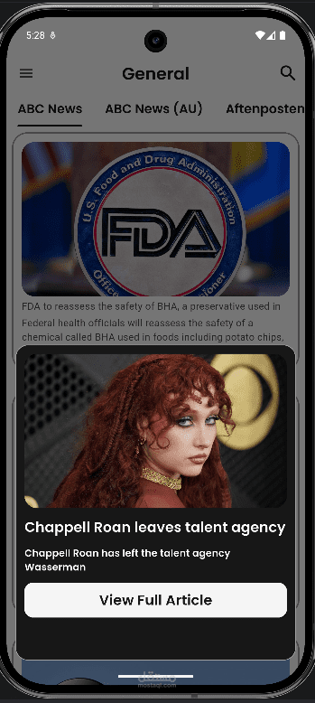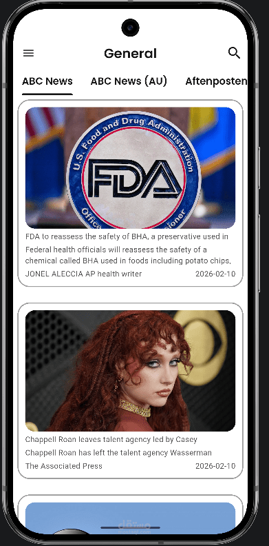 بحث ذكي وفلترة دقيقة: محرك بحث داخلي يسمح بالوصول للخبر المطلوب في ثوانٍ، مع تقسيم الأخبار لفئات (Sports, Business, General).