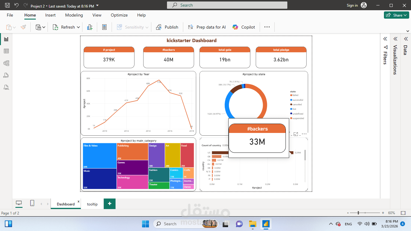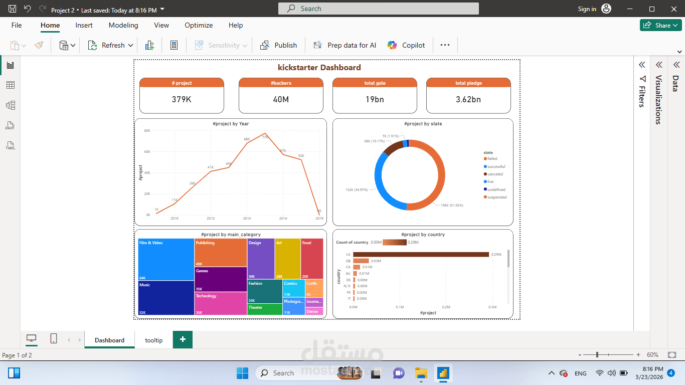 تقدم هذه الداشبورد تحليلًا شاملًا لمشاريع Kickstarter، حيث تعرض نظرة عامة واضحة عن الأداء والاتجاهات وأهم المؤشرات.