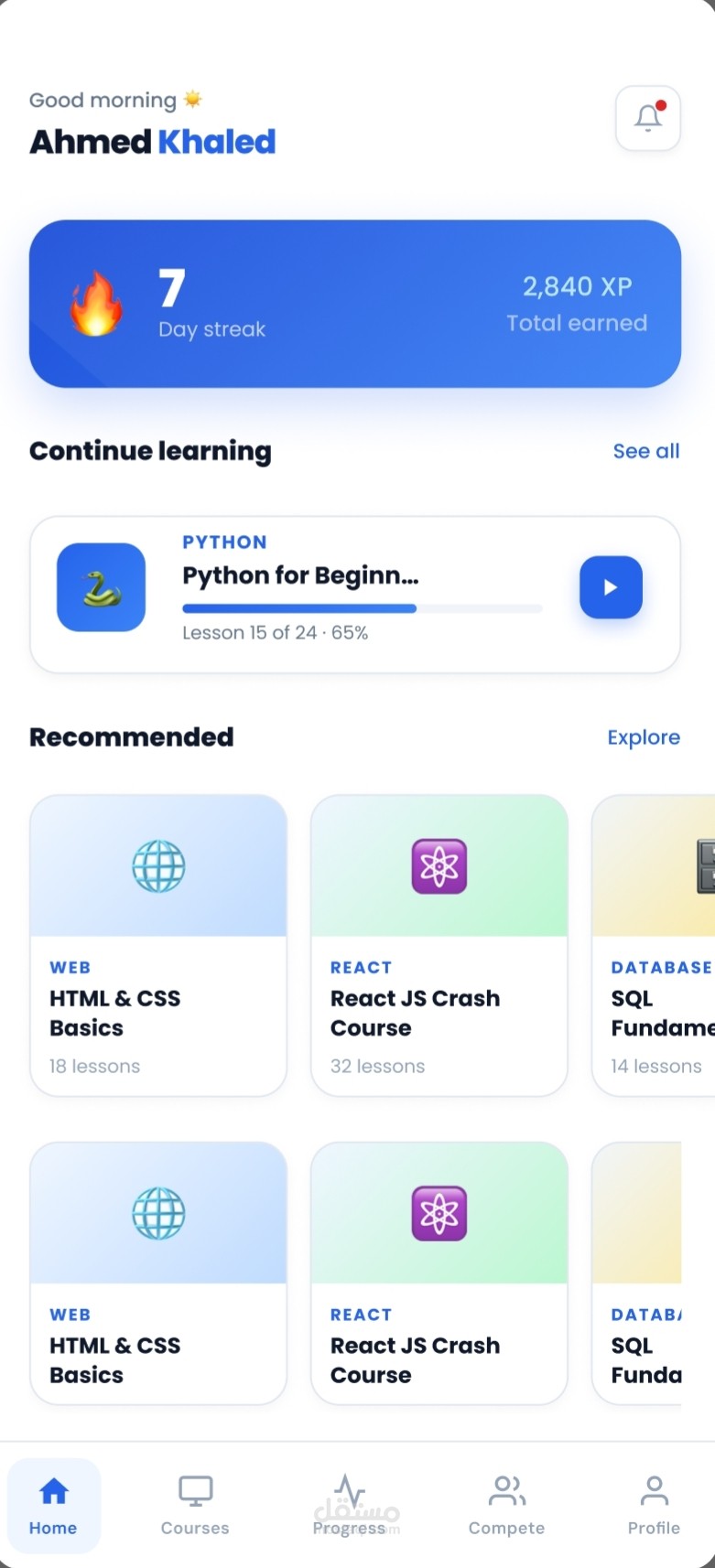 الـ Bottom Navigation Bar: أيقونات واضحة للتنقل (Home – Courses – Progress – Compete – Profile).