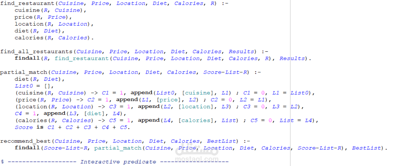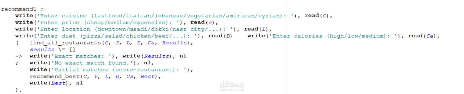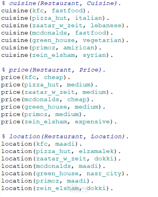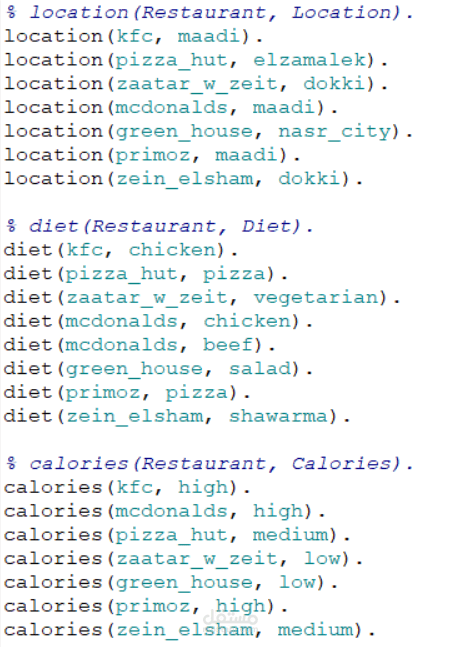 هو سيستم معمول بلغه ال prolog بيبقى عندك database فيها اسامى المطاعم و نوع الاكل اللى بتقدموا و اكل عباره عن ايه و مكان المطعم فين و الشخص بيخش يجرب سيستم بيدخل مثلا نوع الاكل اللى هو عاوزه و ال location بتاعوا و لو عاوز اسم مطعم معين يكتبوا و سعر الاكل يبقى غالى و لا رخيص و لا عادى لو كل حاجه متوافقه مع ال database هيطلع ناتج على طول اما لو ما لاقاش هيجبلوا كل مطاعم اللى قريبه من الحاجات اللى كتبها و كل مطعم بيشابه اللى عاوزوا فى كام واحده