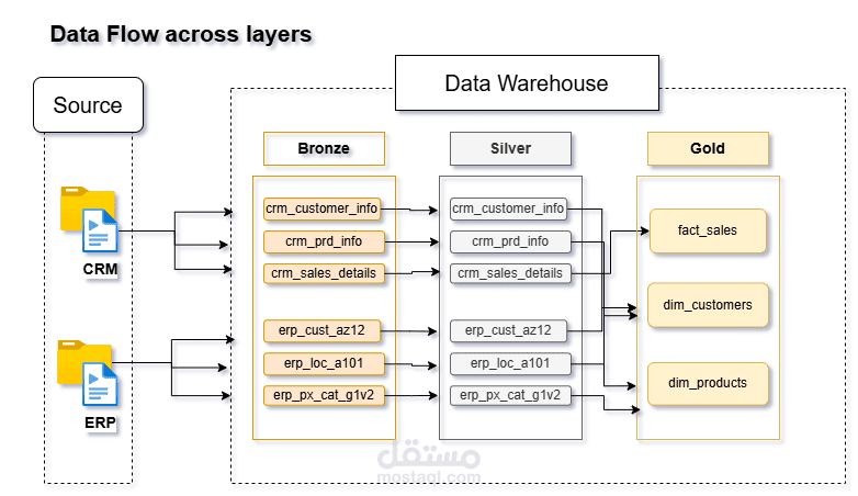 تنفيذ سكربتات SQL منظمة حسب الطبقات، إنشاء مفاتيح بديلة (Surrogate Keys)، تطبيق التكامل المرجعي (Referential Integrity)، ودمج مصادر متعددة داخل مستودع بيانات موحد.