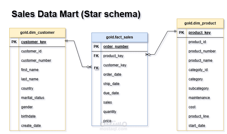 تصميم نموذج نجمي (Star Schema) يتضمن جداول حقائق (المبيعات، المخزون) وجداول أبعاد (العملاء، المنتجات، التواريخ) محسّنة للاستعلامات التحليلية.