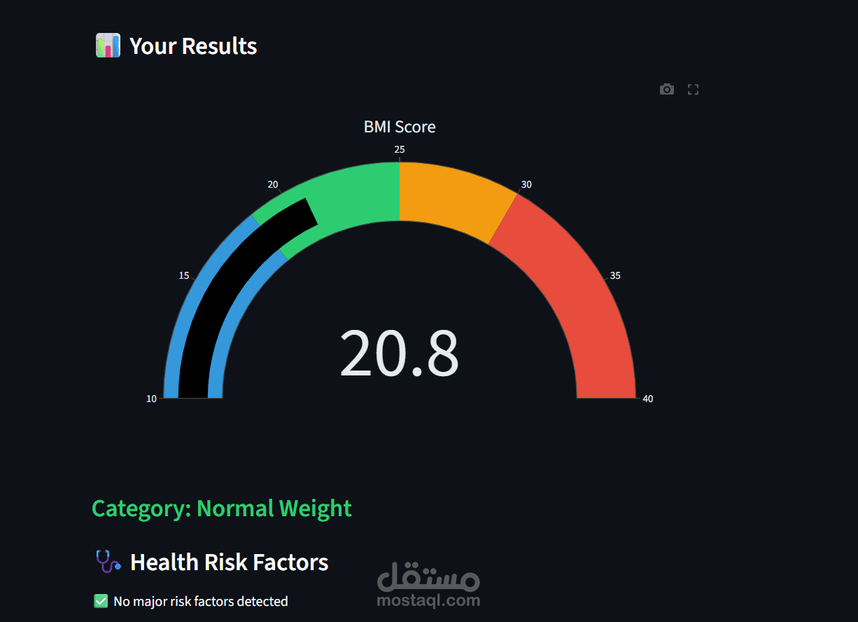 تطبيق ويب بيحسب مؤشر كتلة الجسم (BMI) ويقيّم المخاطر الصحية بناءً على بيانات المستخدم زي الوزن والطول والعمر وعادات الحياة. بيعرض النتيجة بشكل بصري من خلال مقياس تفاعلي مع تحليل مخصص لكل حالة.