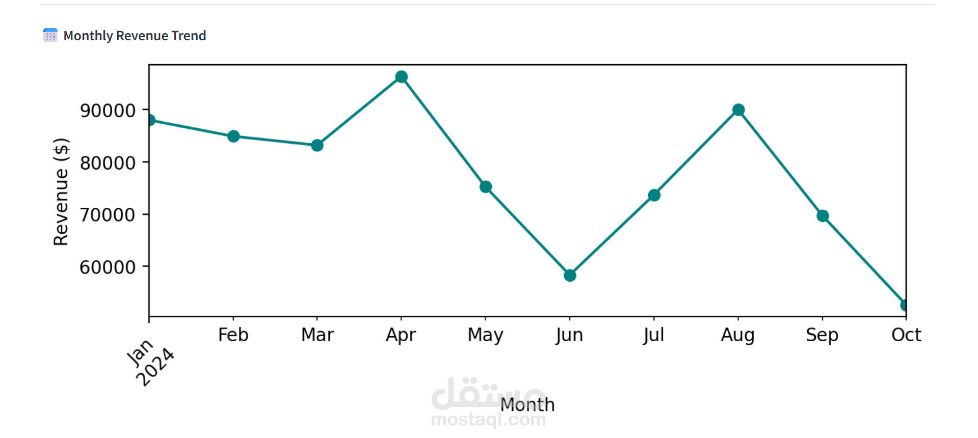 تحليل تفصيلي: رسم بياني شهري للمبيعات، تحليل المبيعات حسب الفئة، وتوزيع الإيرادات حسب المنتج.