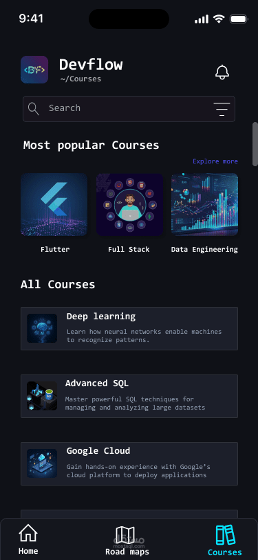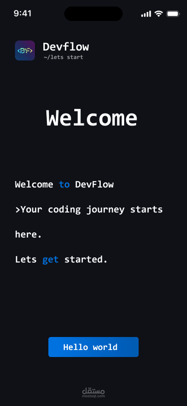 تصميم تطبيق موبايل اجتماعي مخصص للمبرمجين والمطورين (Developer Community & Learning Hub) باسم DevFlow – تصميم عصري داكن (Dark Mode) جذاب ومركز على تجربة المستخدم السلسة.