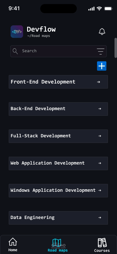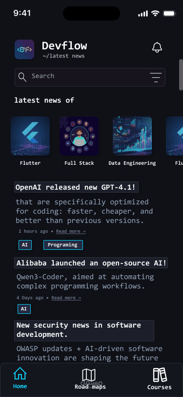 أقسام رئيسية: أخبار الـ AI والتطوير، كورسات وRoadmaps (Full-Stack, Frontend, Backend, Flutter, AI...)