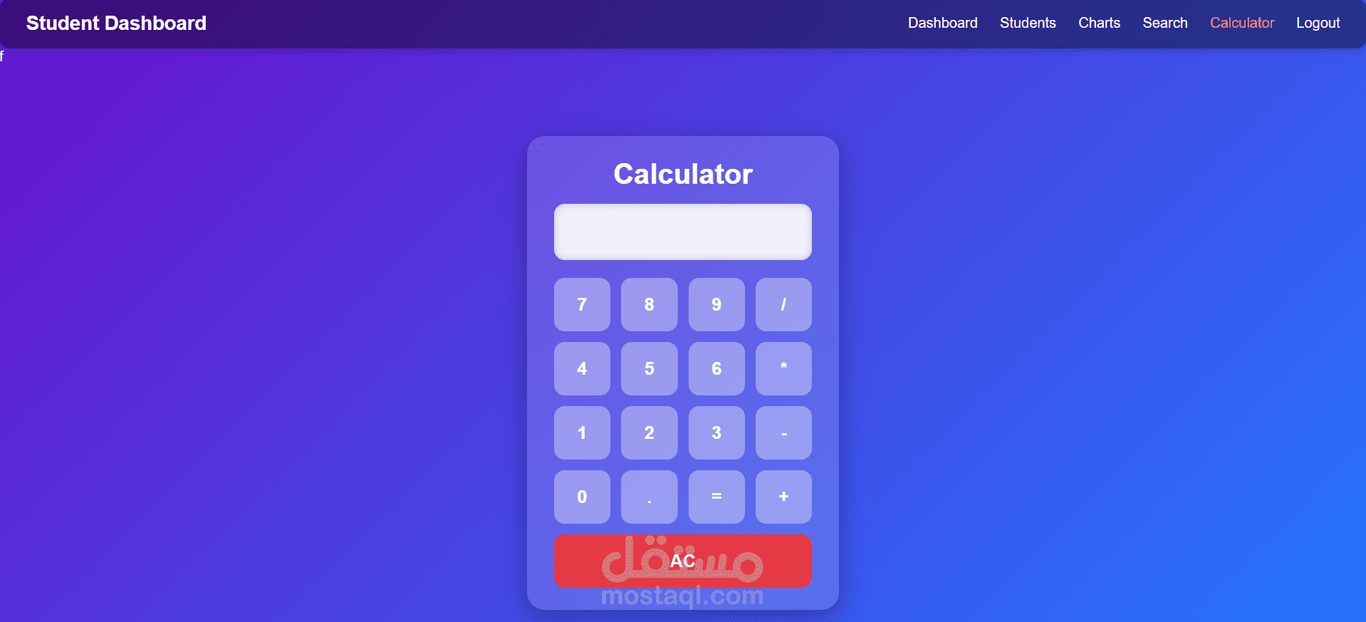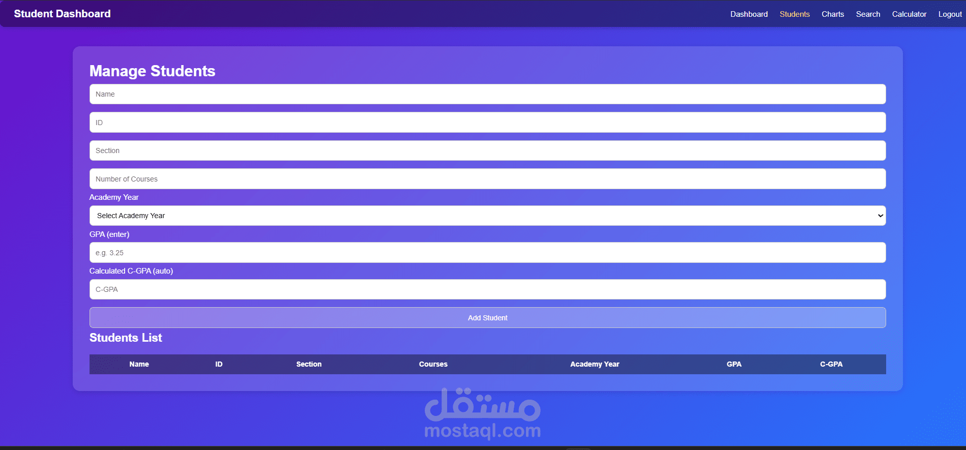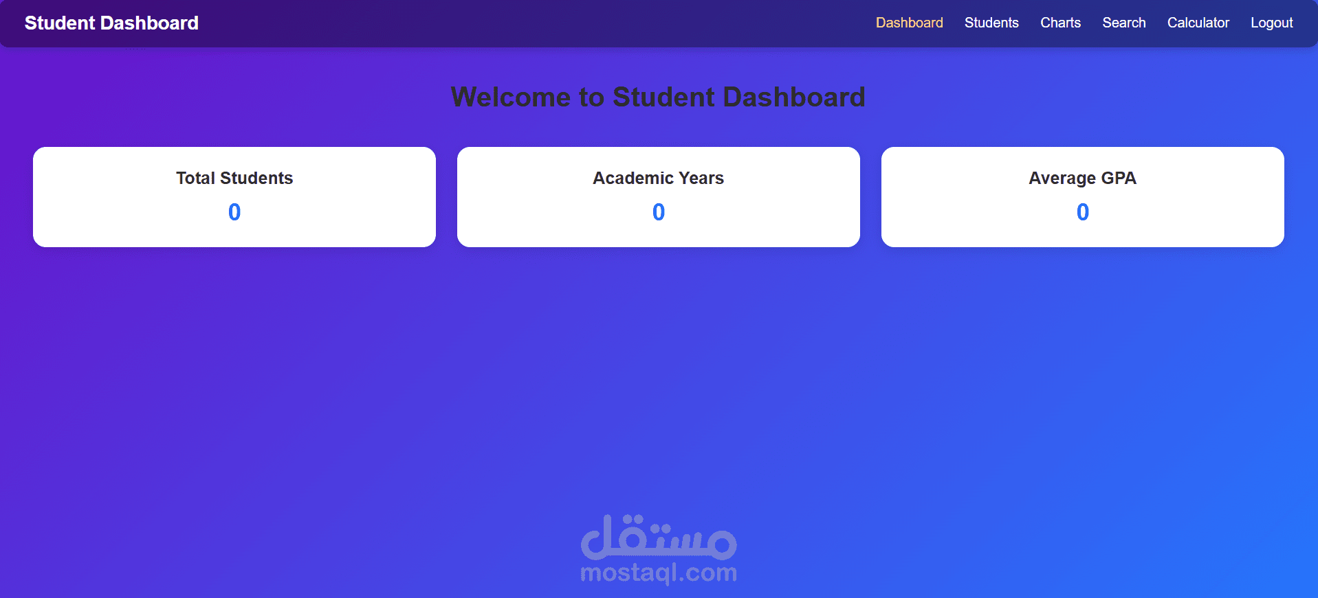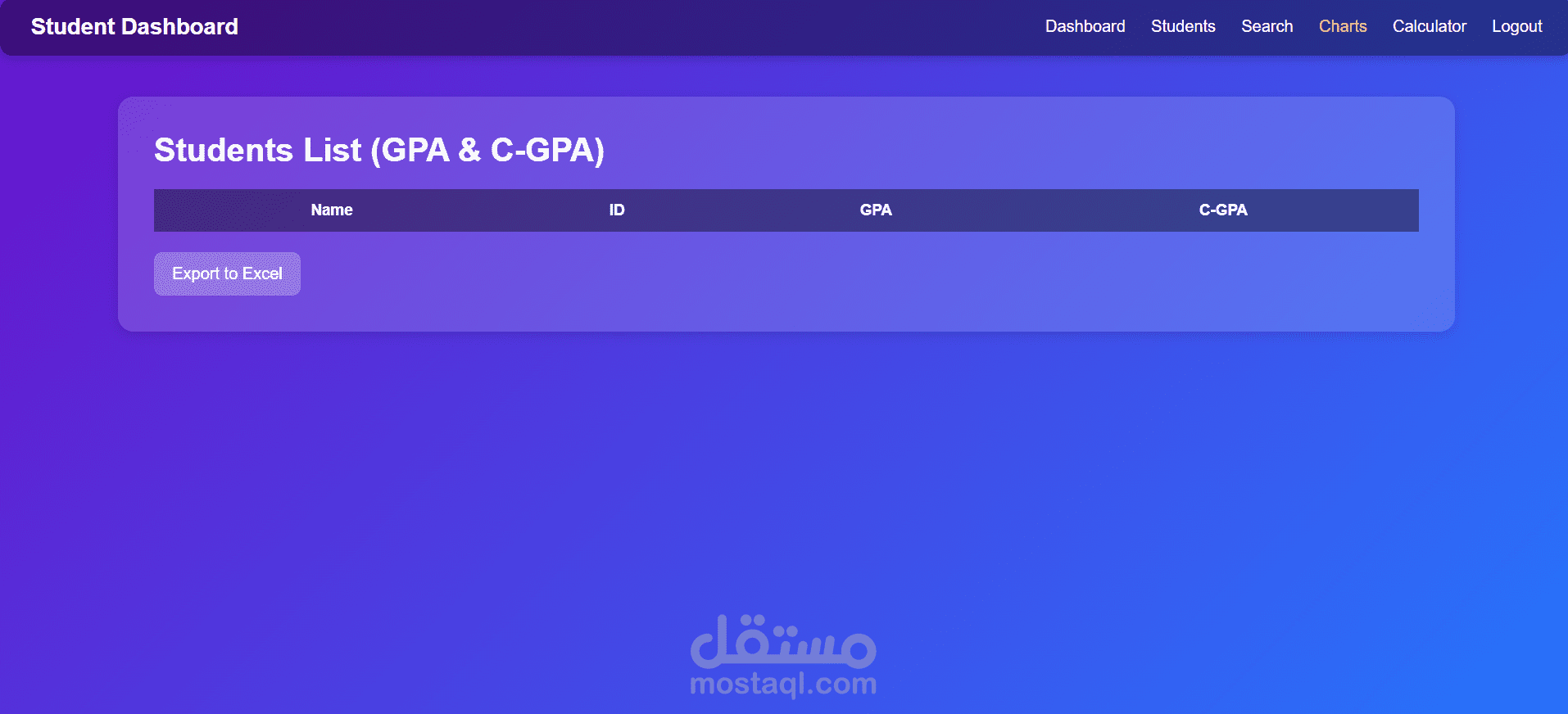 نظام تنقل بسيط يضم أقسام: Dashboard، Students، Charts