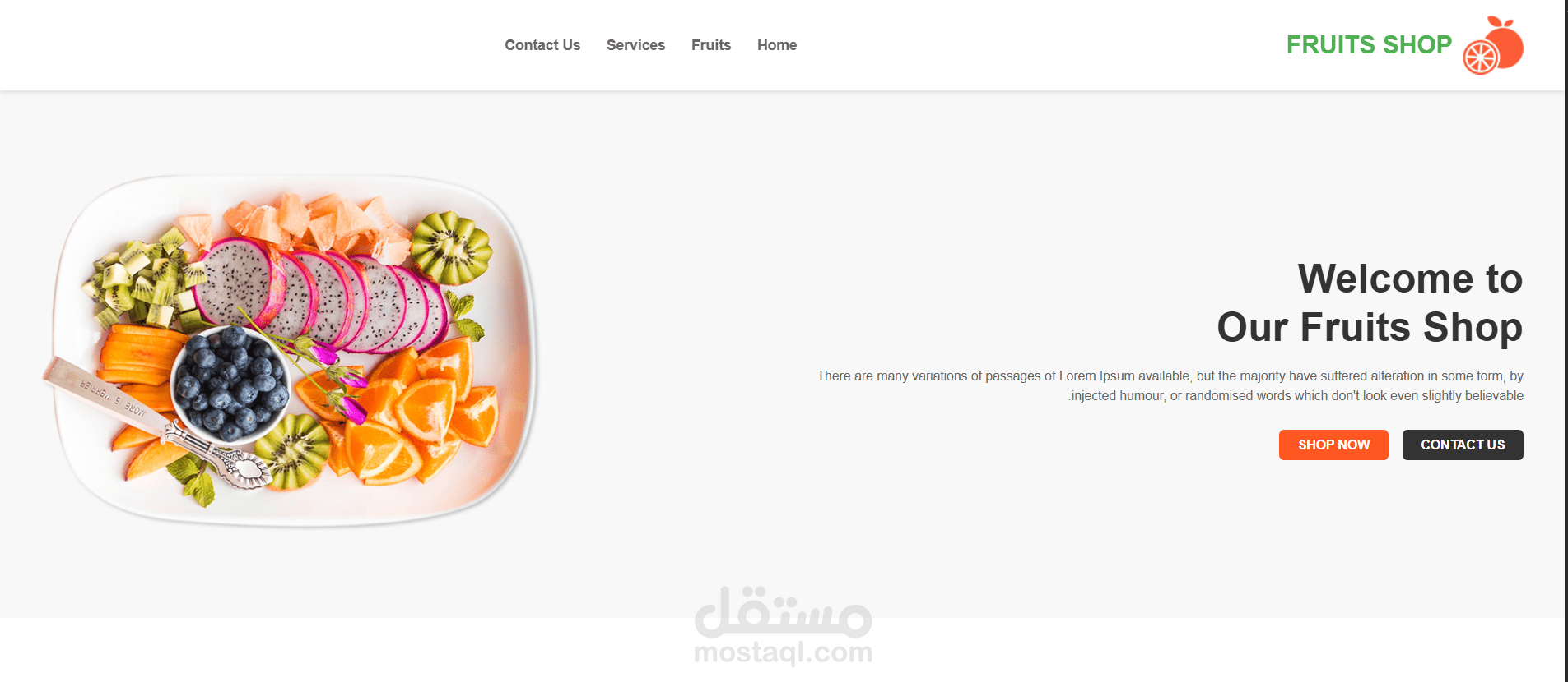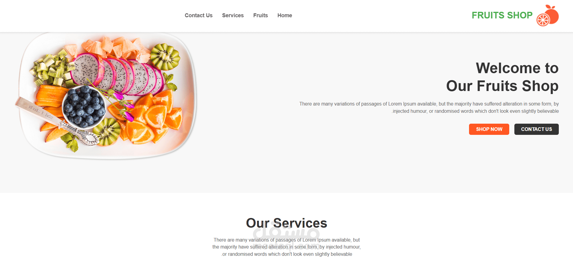 صفحة رئيسية (Home) تحتوي على رسالة ترحيبية: Welcome to Our Fruit Shop